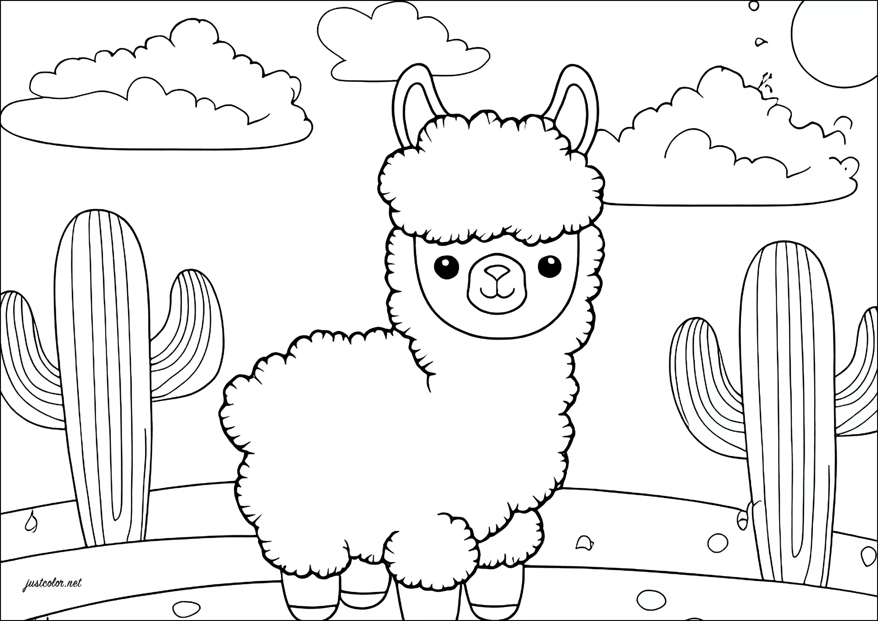 Piccolo lama semplice con cactus. (Pagina da Colorare)