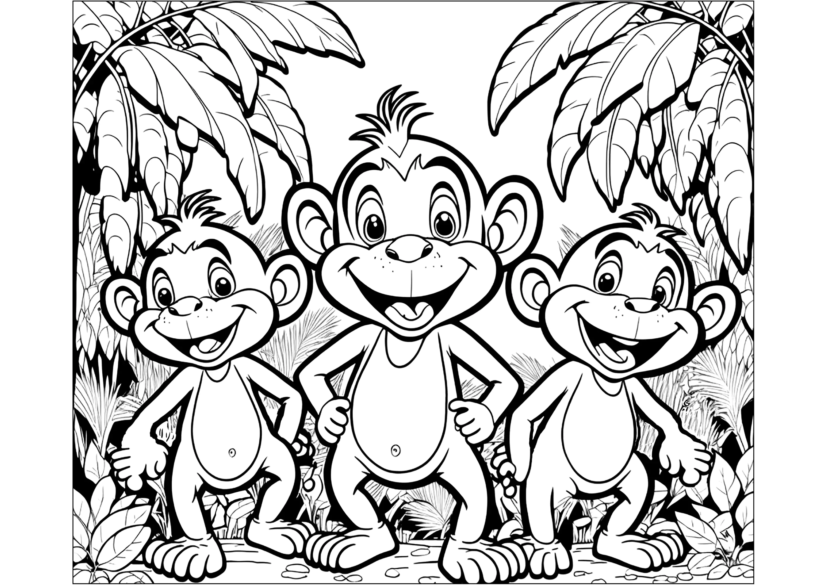 Questo disegno da colorare è perfetto per i bambini che amano gli animali e la natura. Mostra tre giovani scimmie che si divertono nella giungla. Questo disegno stimola la loro immaginazione e la loro creatività.