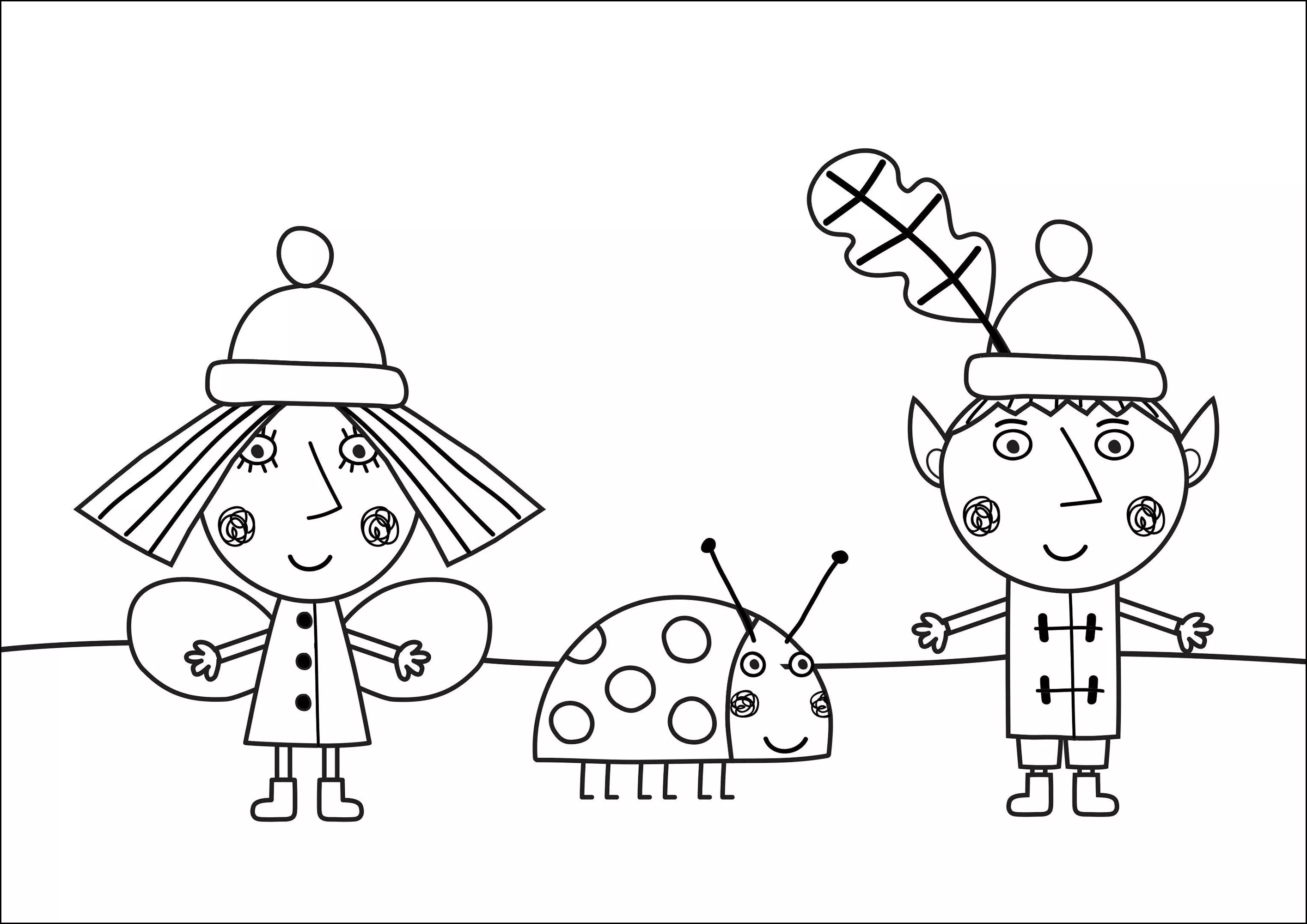 Ben e Holly con la loro amica coccinella. (Pagina Il Piccolo Regno di Ben e Holly da Colorare)