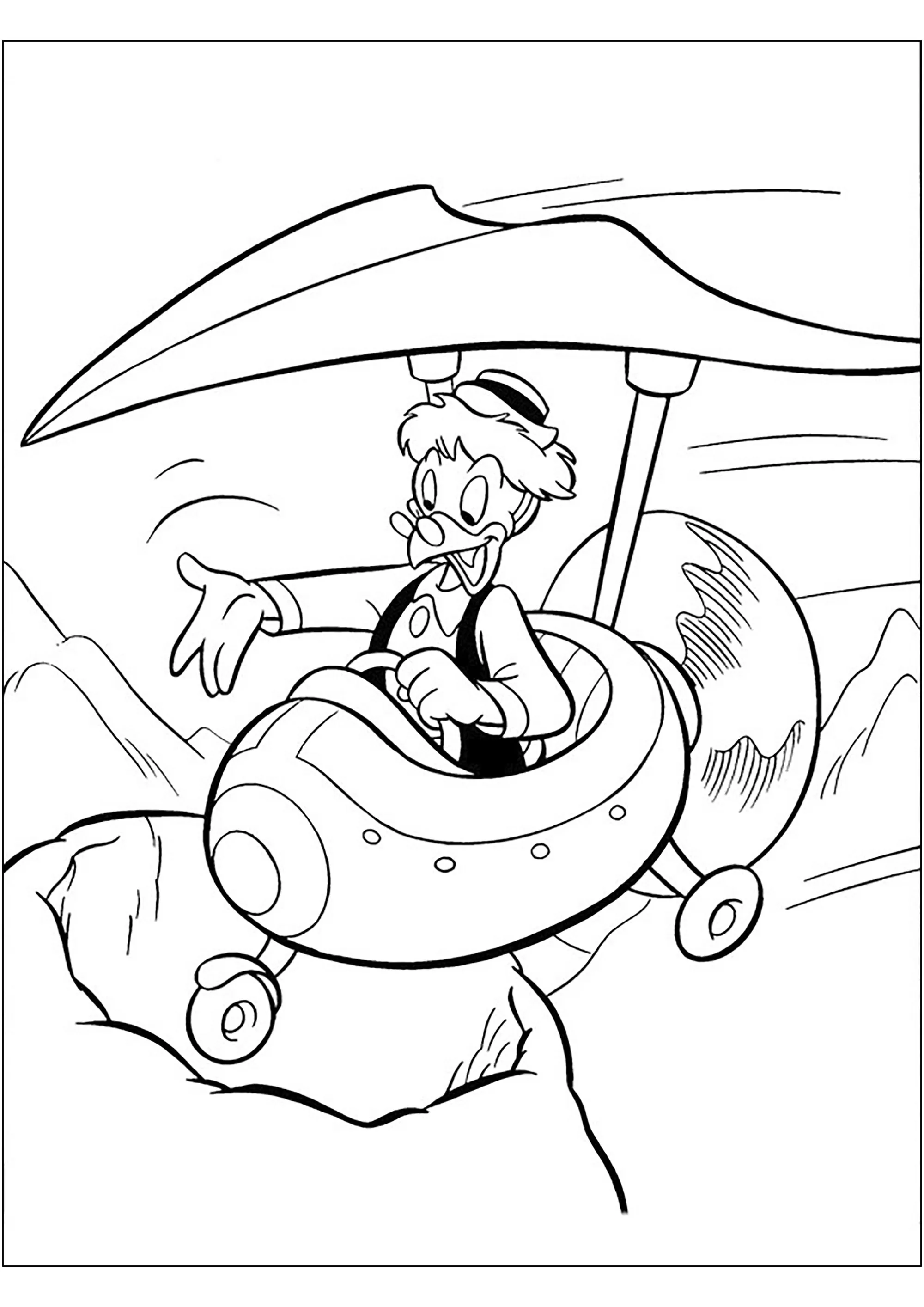 Géo Trouvetou e una delle sue invenzioni volanti. (Pagina La Banda di Paperino da Colorare)