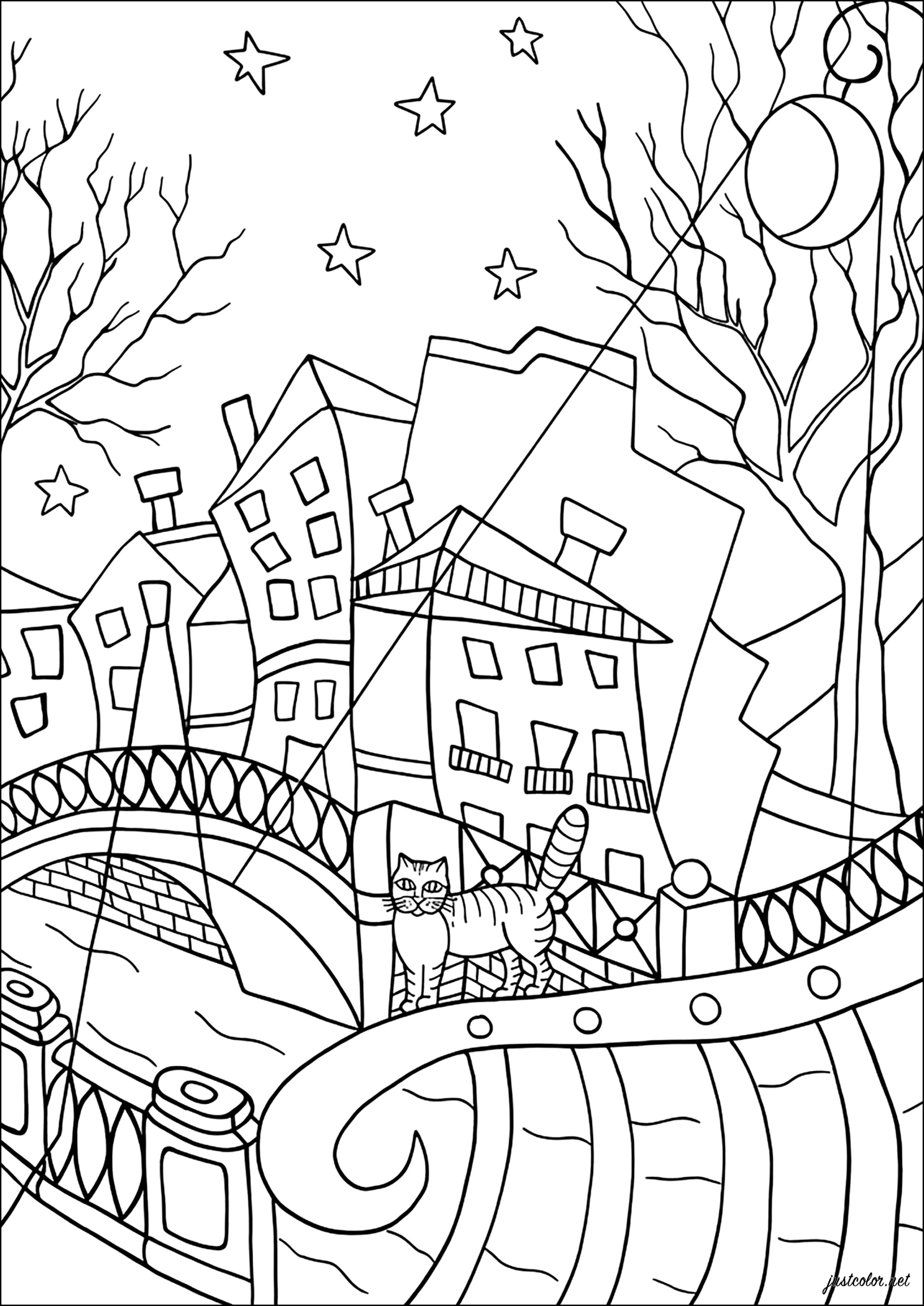 从一座优雅的桥上,警惕的目光凝视着星空下倾斜房屋的景象。