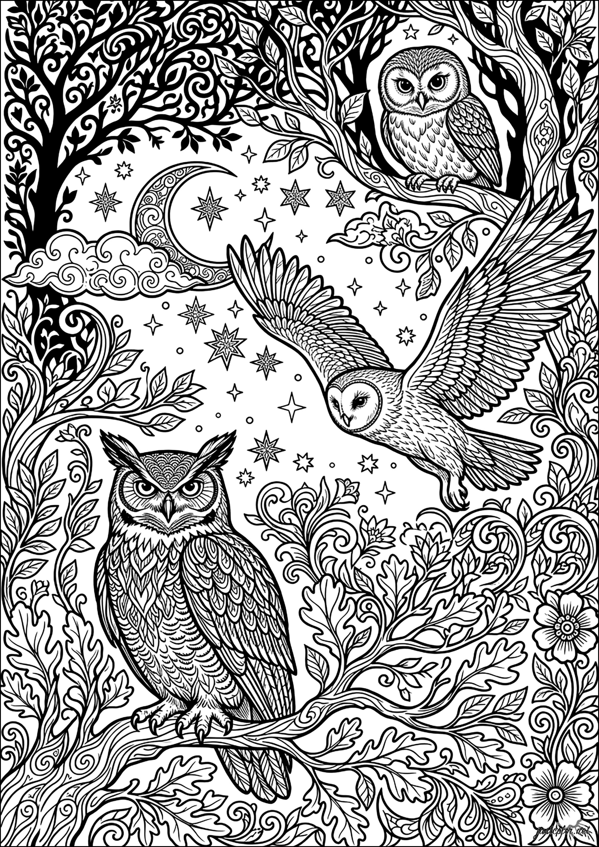 鸟儿栖息在繁复枝叶环绕的枝头,点缀着新月与繁星的天幕之下。