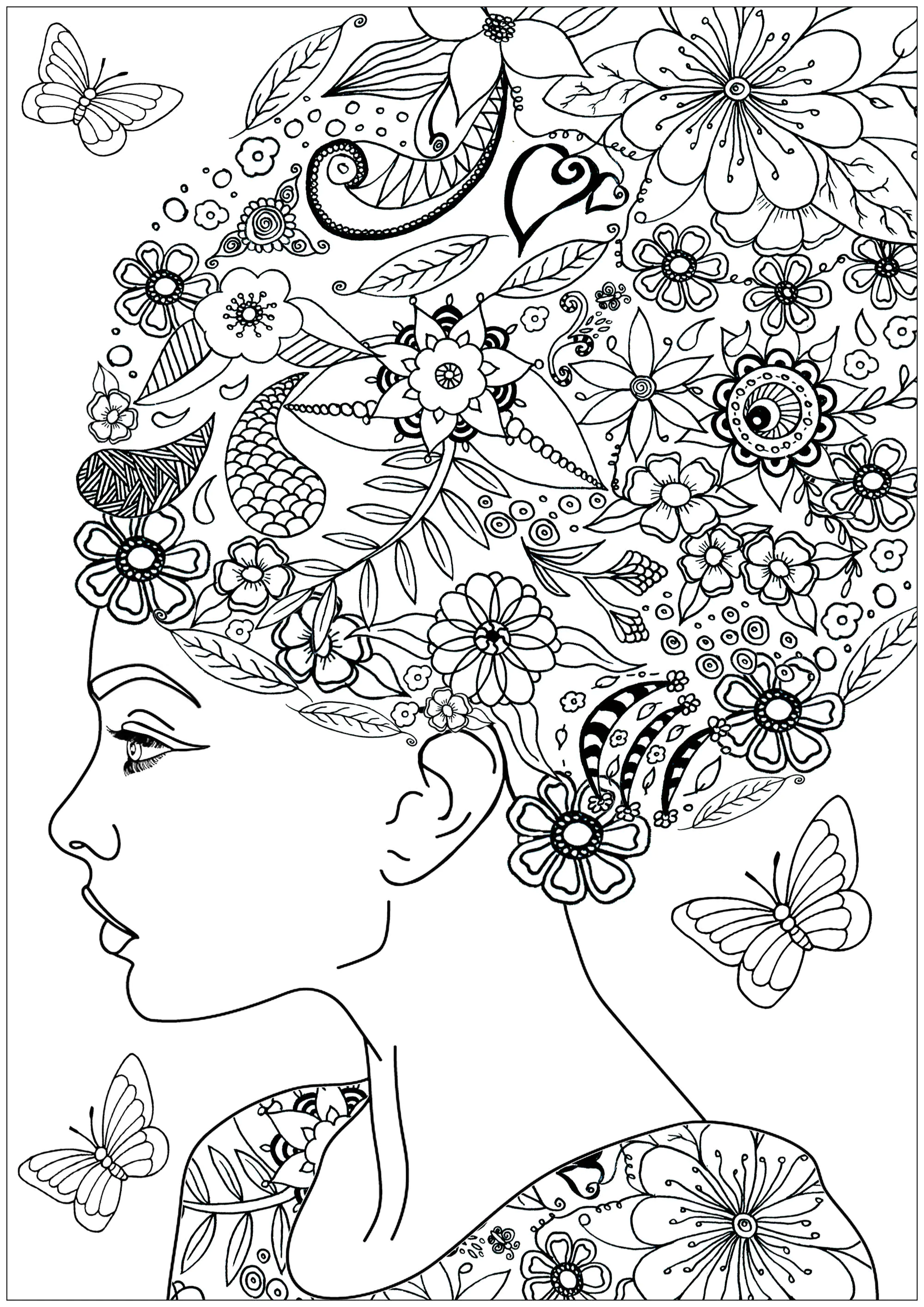 给这位女士头发上美丽的花朵和树叶......以及在她身边飞舞的树蝴蝶涂上颜色