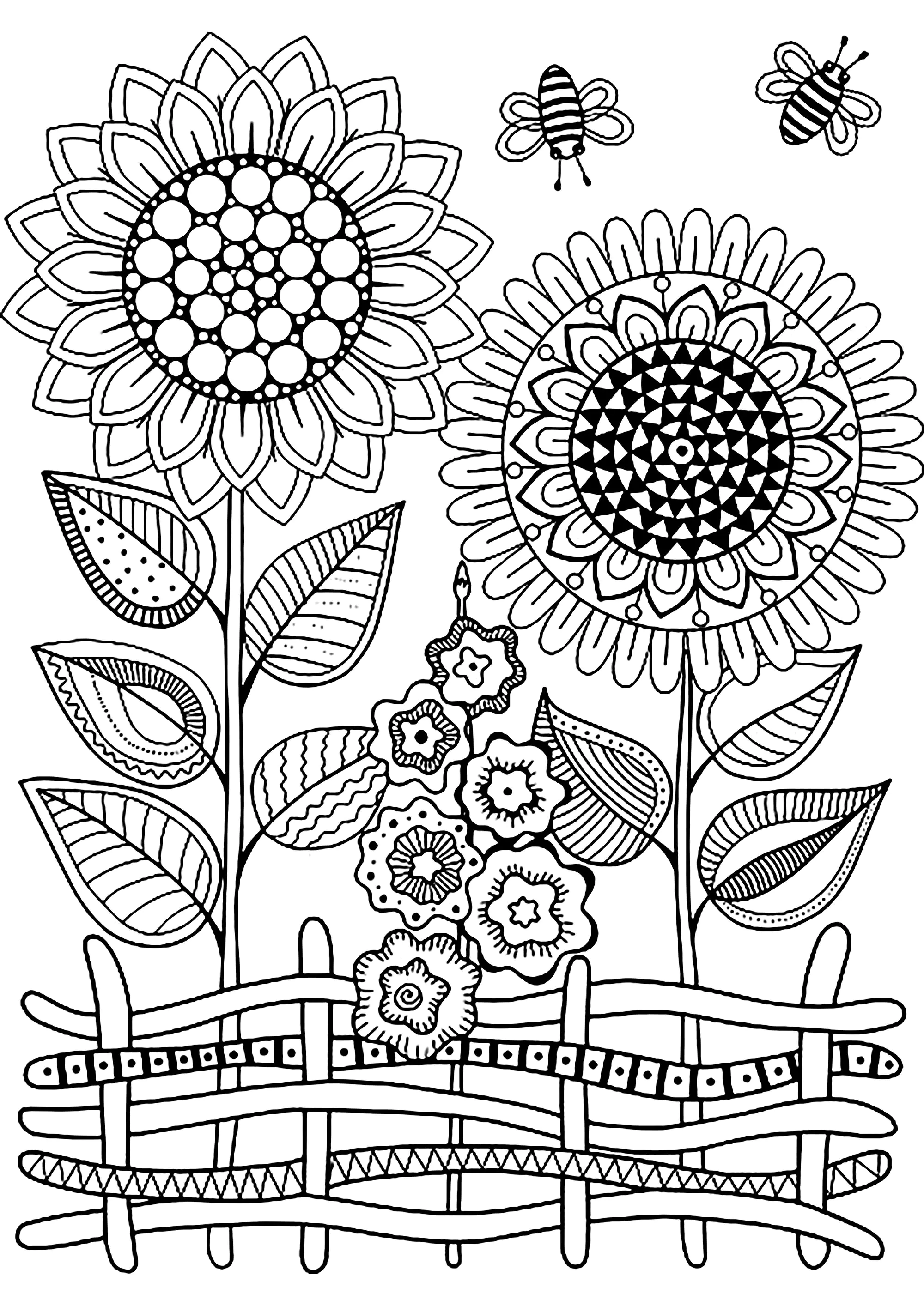 两朵大花和蜜蜂 (成人复杂着色 : Azyrielle)