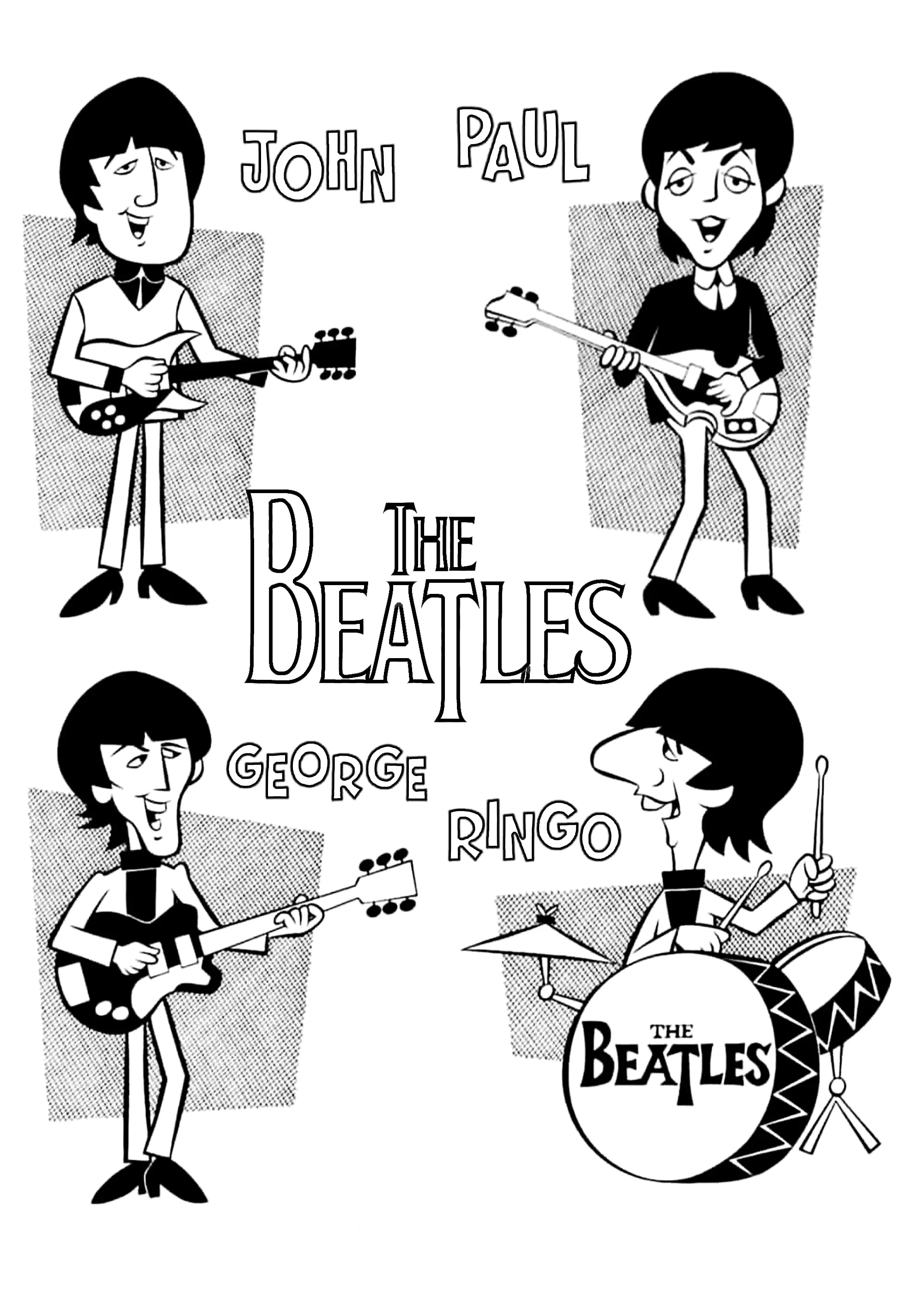 一幅卡通风格、复古的“披头士四人组”填色页。