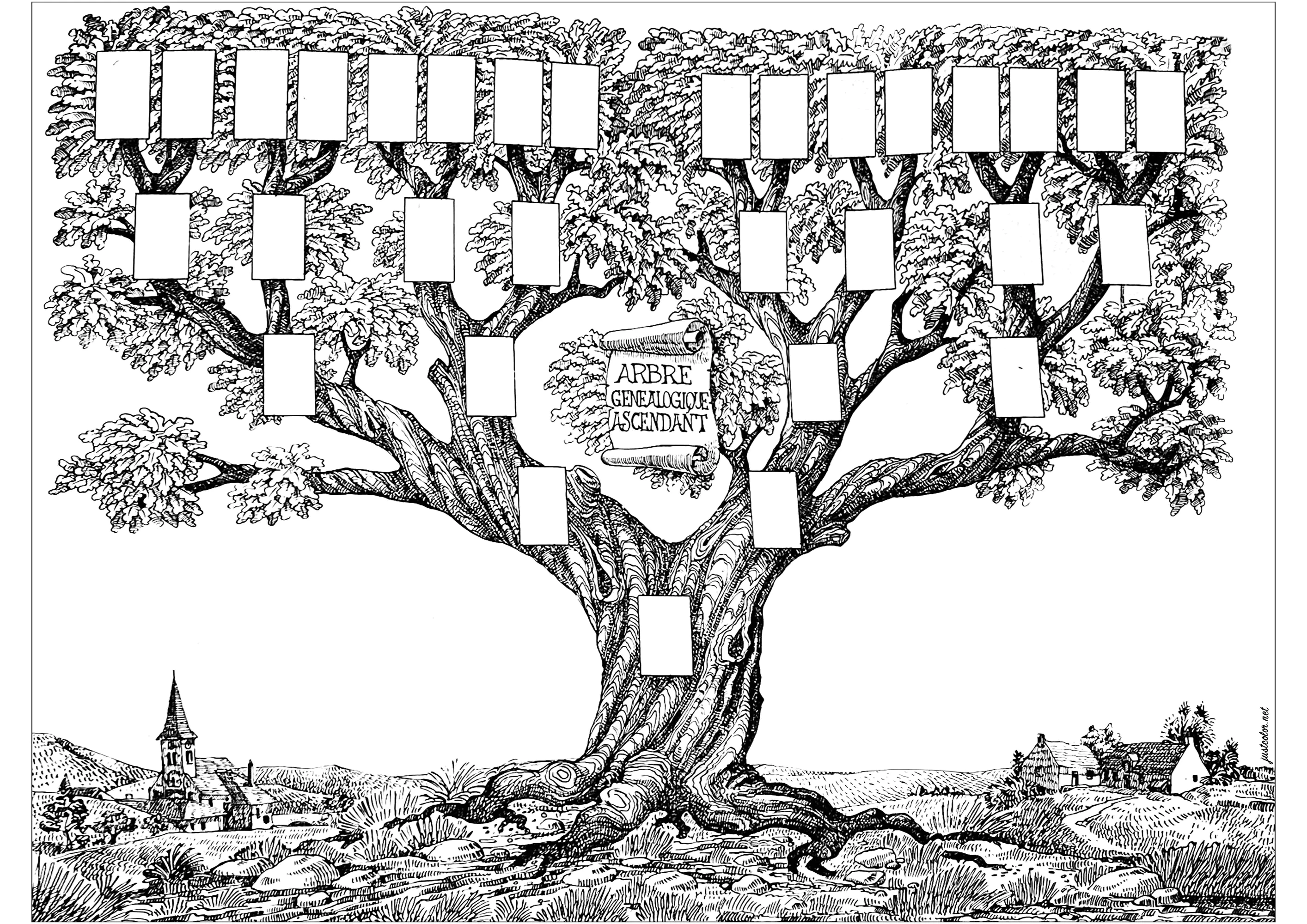 给这幅美丽的家谱涂上颜色,它是 20 世纪初一位法国插画家的作品。