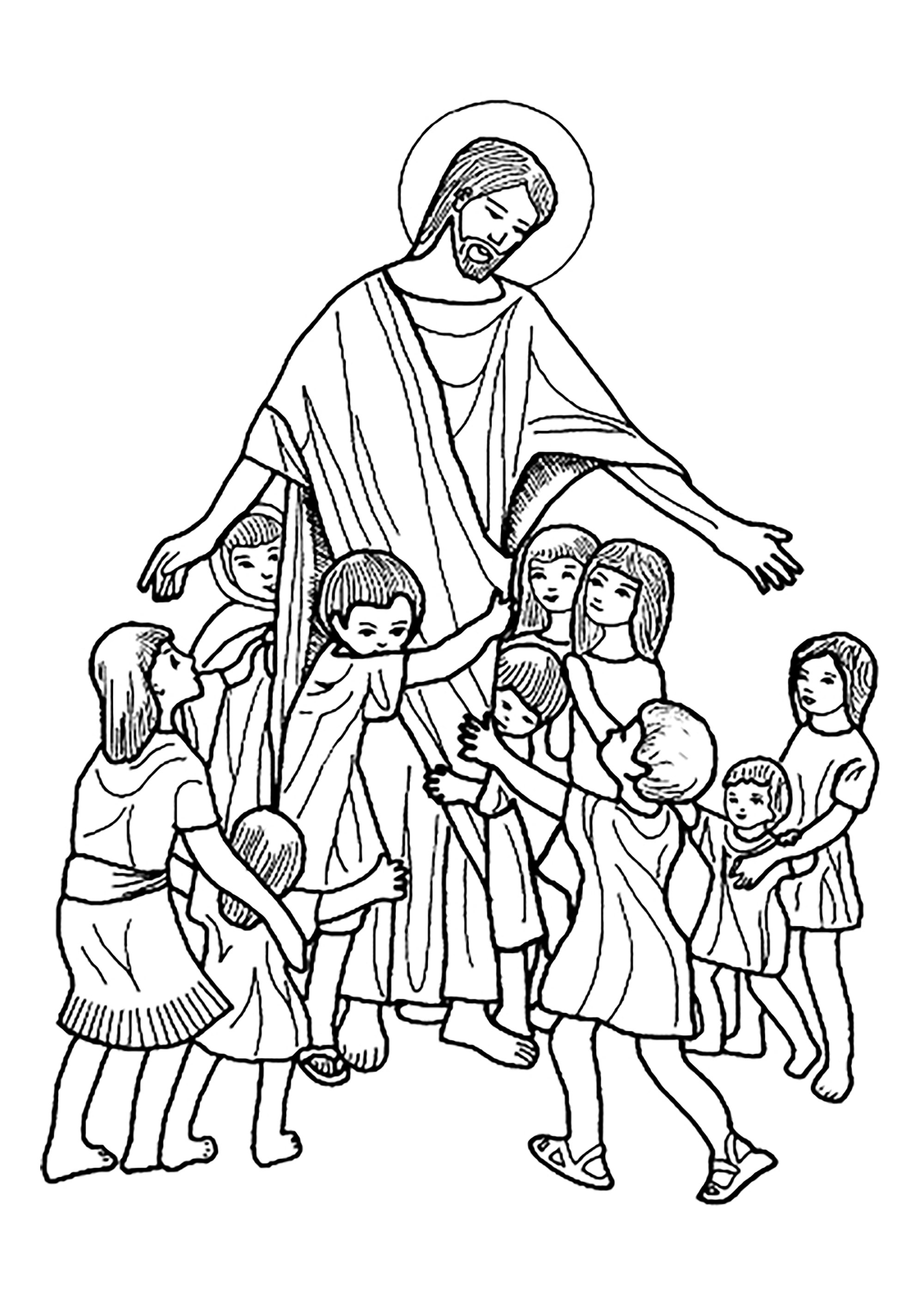 Jesus rodeado de crianças (Página de Cristandade para colorir para crianças)
