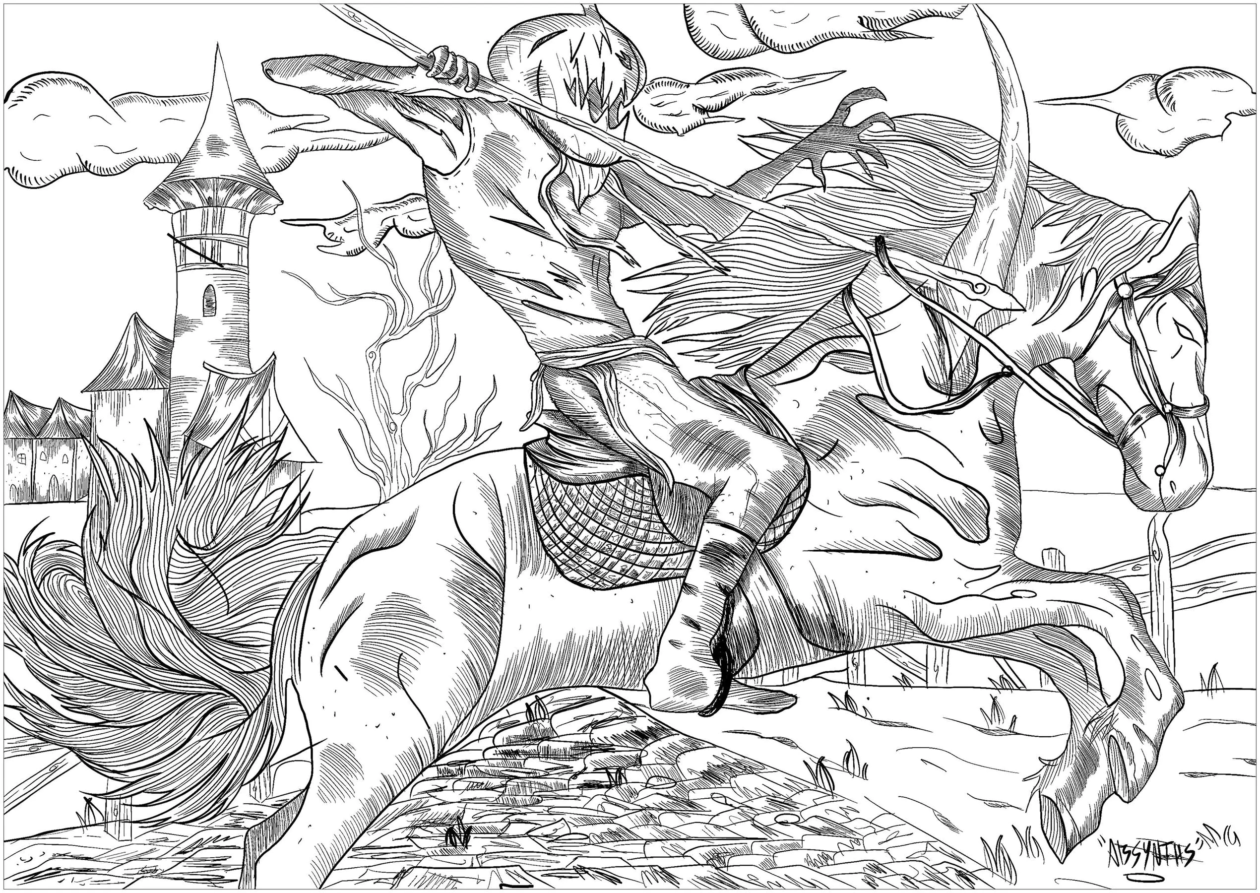 Ein böser Ritter mit einem Kürbiskopf, der auf seinem Geisterpferd reitet ... Ein wahrer Albtraum zum Ausmalen!