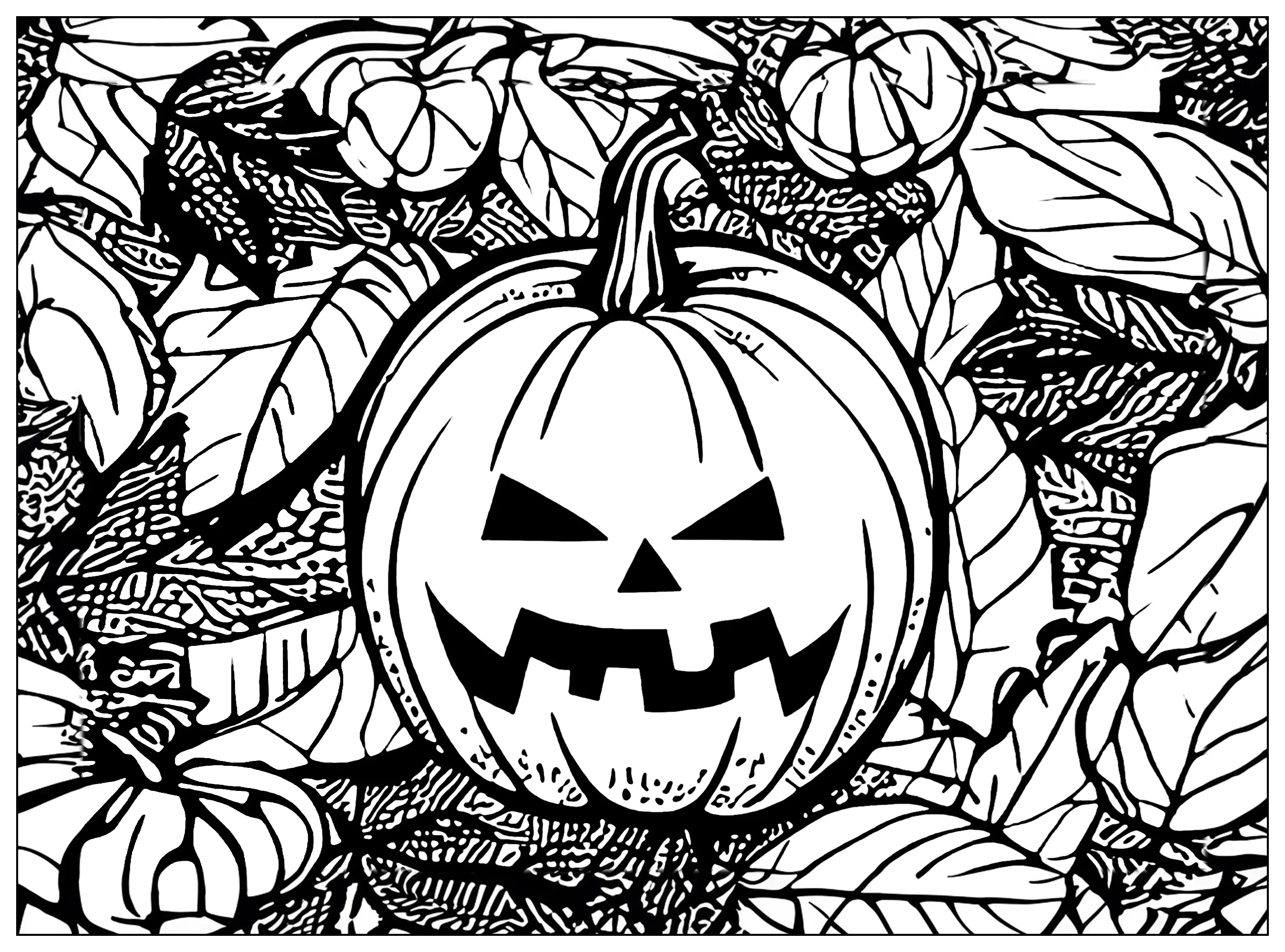 Jack-o'-Lantern-Kürbis auf blattgefülltem Hintergrund (Ausmalbild von Halloween)