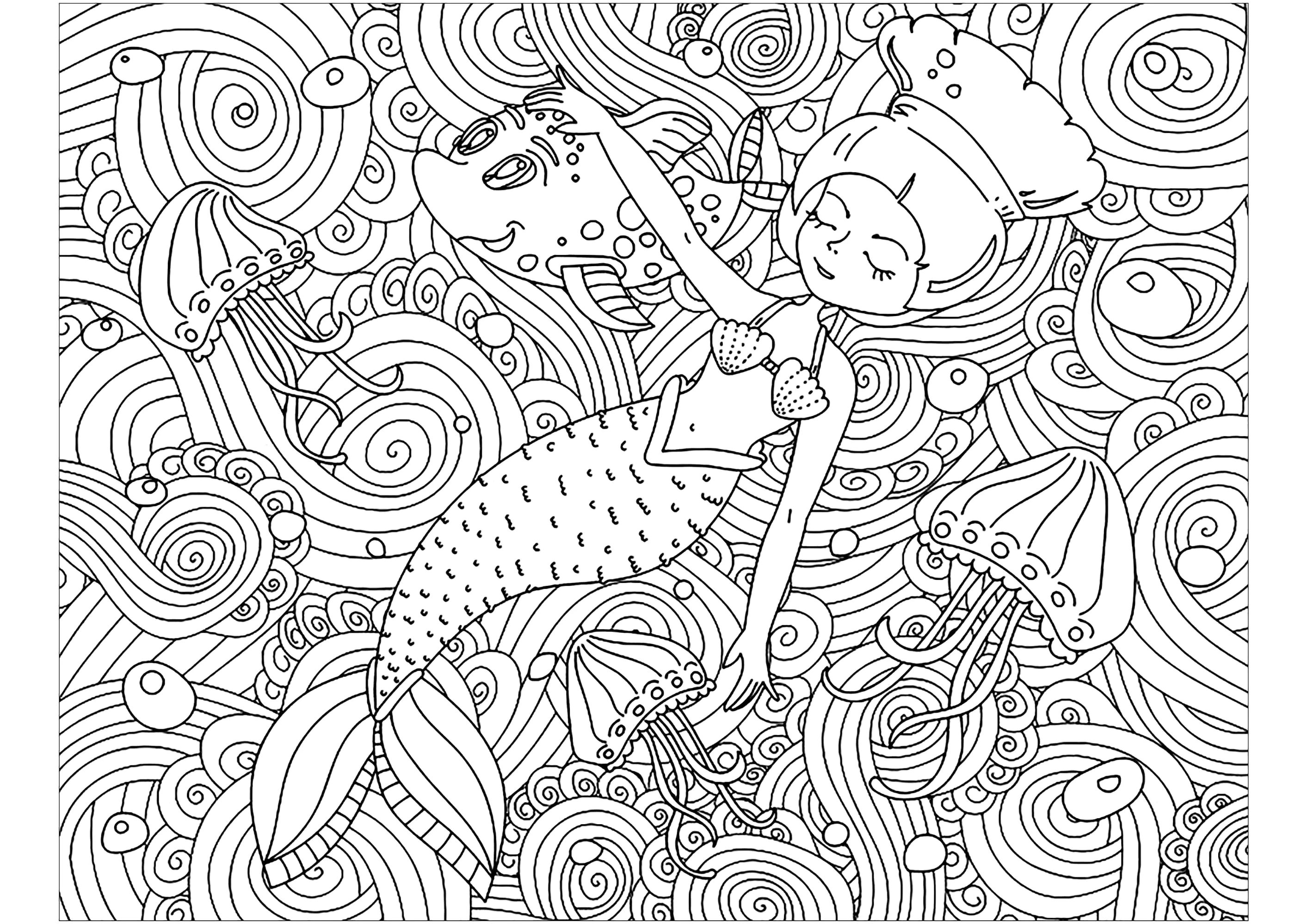 Malen Sie diese kleine Meerjungfrau aus, die friedlich in einem Meer voller schöner, verschlungener Muster schläft.