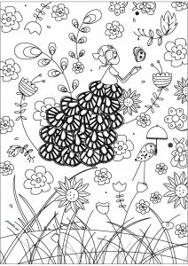 Eine inspirierende Färbung von einer Frau mit einem schönen Schmetterling, umgeben von schönen Blumen