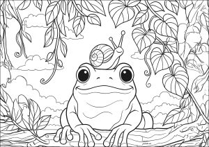 Eine echte Herausforderung! Auf dieser Zeichnung hockt ein hübscher Frosch auf einem Pilz. Sie sind von einer faszinierenden Vegetation umgeben ... Es gibt eine Menge von Details zu berücksichtigen, um diese Färbung zu machen.