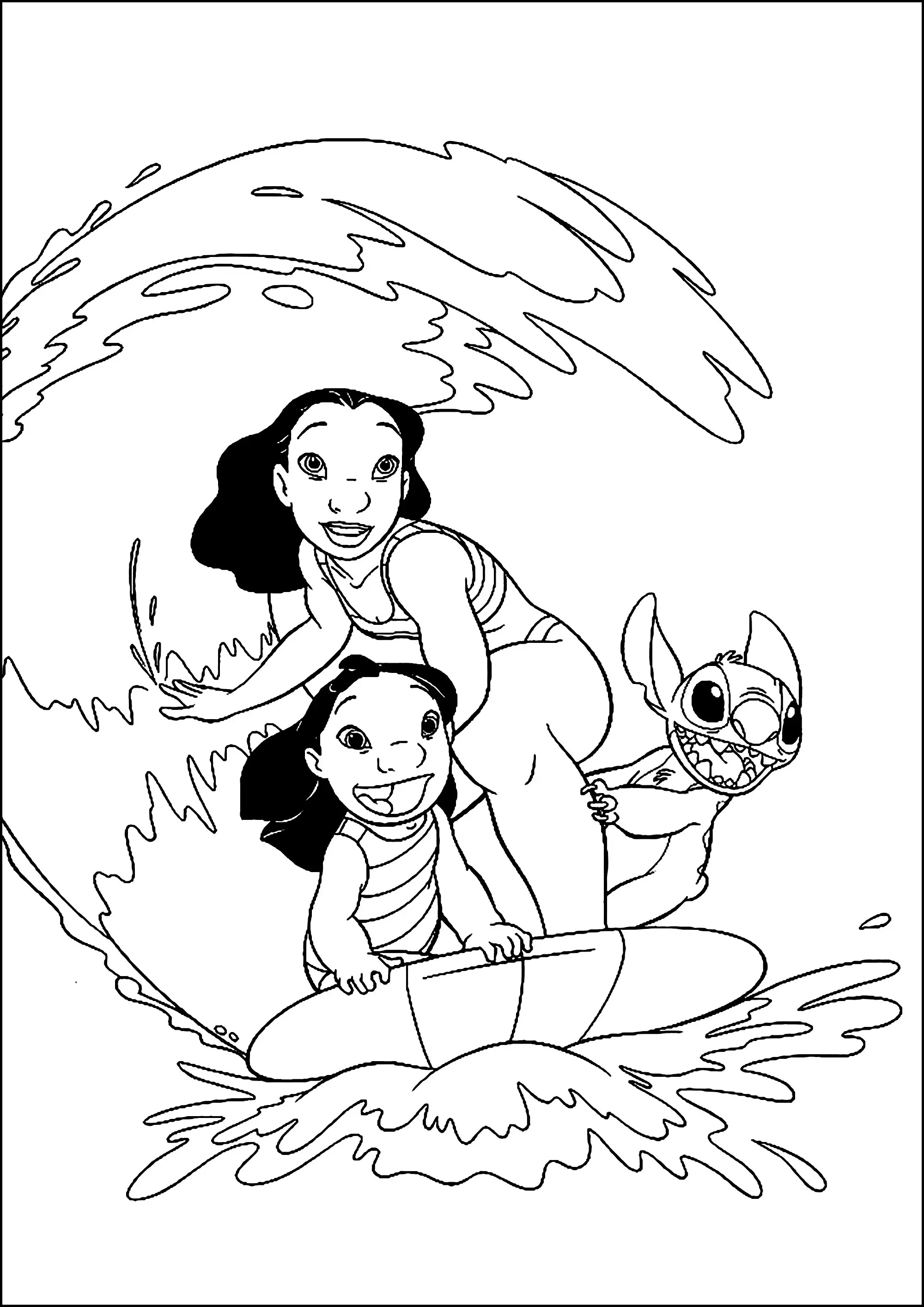 Stich et ses amies font du surf (Coloriage de Lilo et Stich)