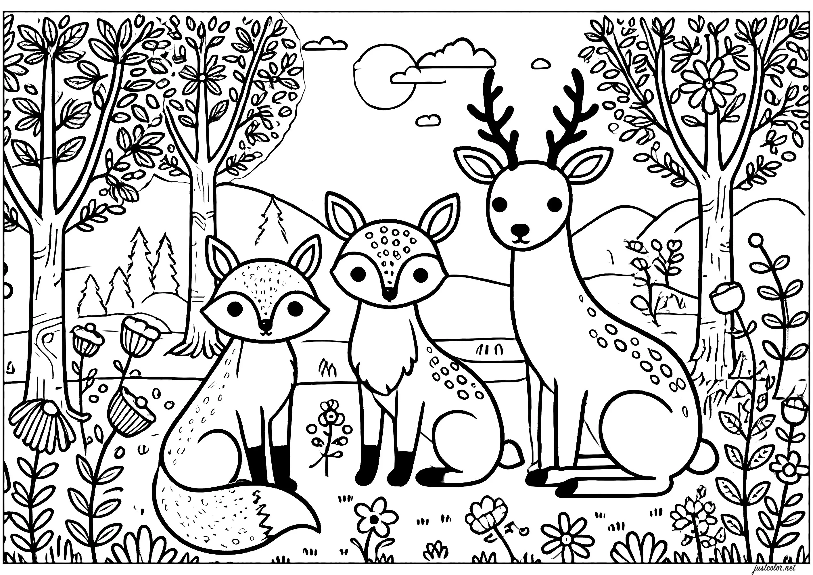 Ce coloriage montre un renard, un faon et un cerf assis paisiblement dans une clairière de forêt. Les trois animaux sont entourés de fleurs et de végétation, sous un ciel dégagé avec quelques nuages. Les arbres et les collines en arrière-plan ajoutent de la profondeur à la scène, créant une ambiance sereine et naturelle.