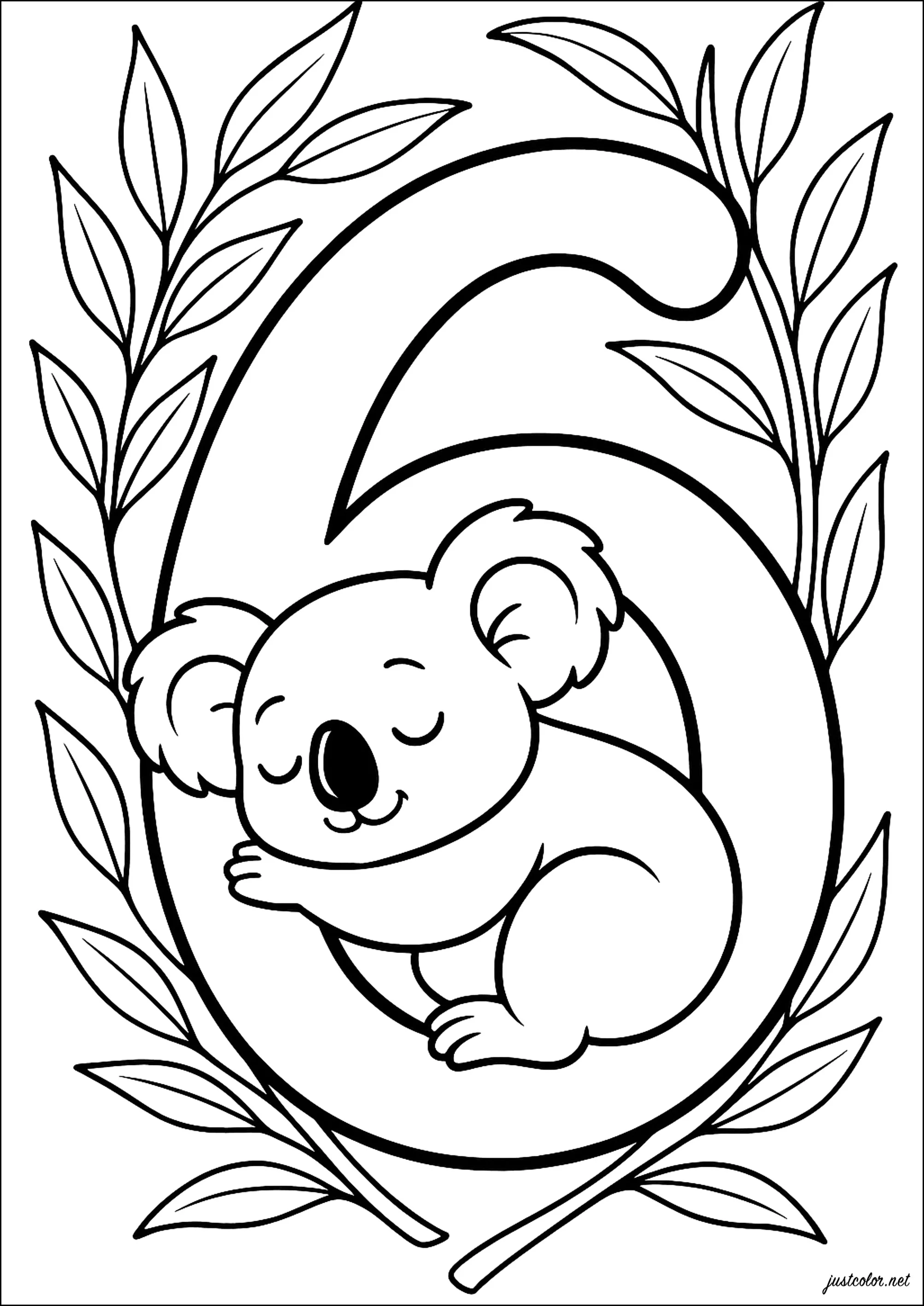 Un adorable koala qui fait un gros câlin à un chiffre tout en étant entouré de feuilles. Son visage paisible évoque une atmosphère de sérénité.