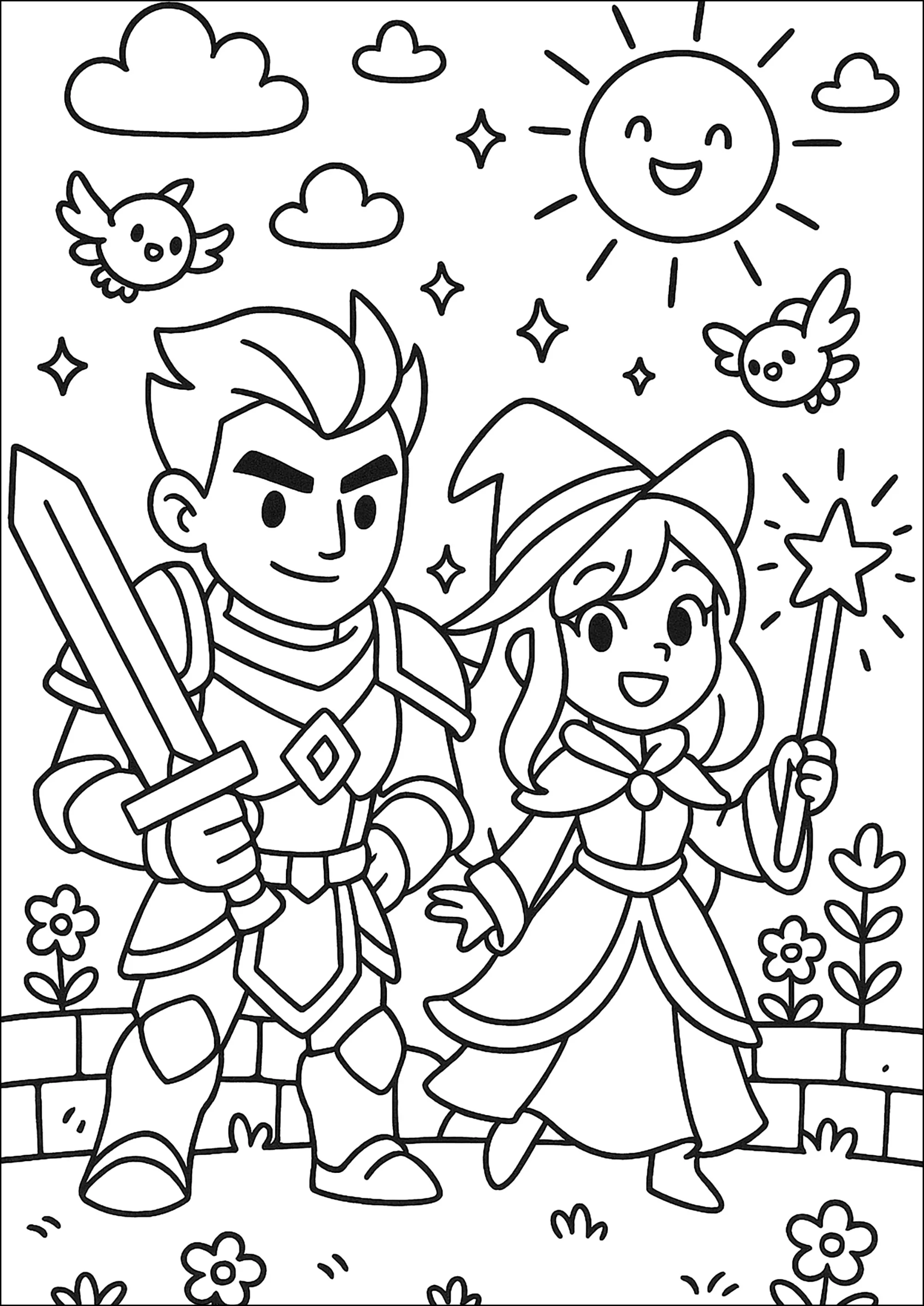 Un chevalier courageux et une sorcière souriante, entourés de nuages, d'oiseaux joyeux et d'un soleil rayonnant.
