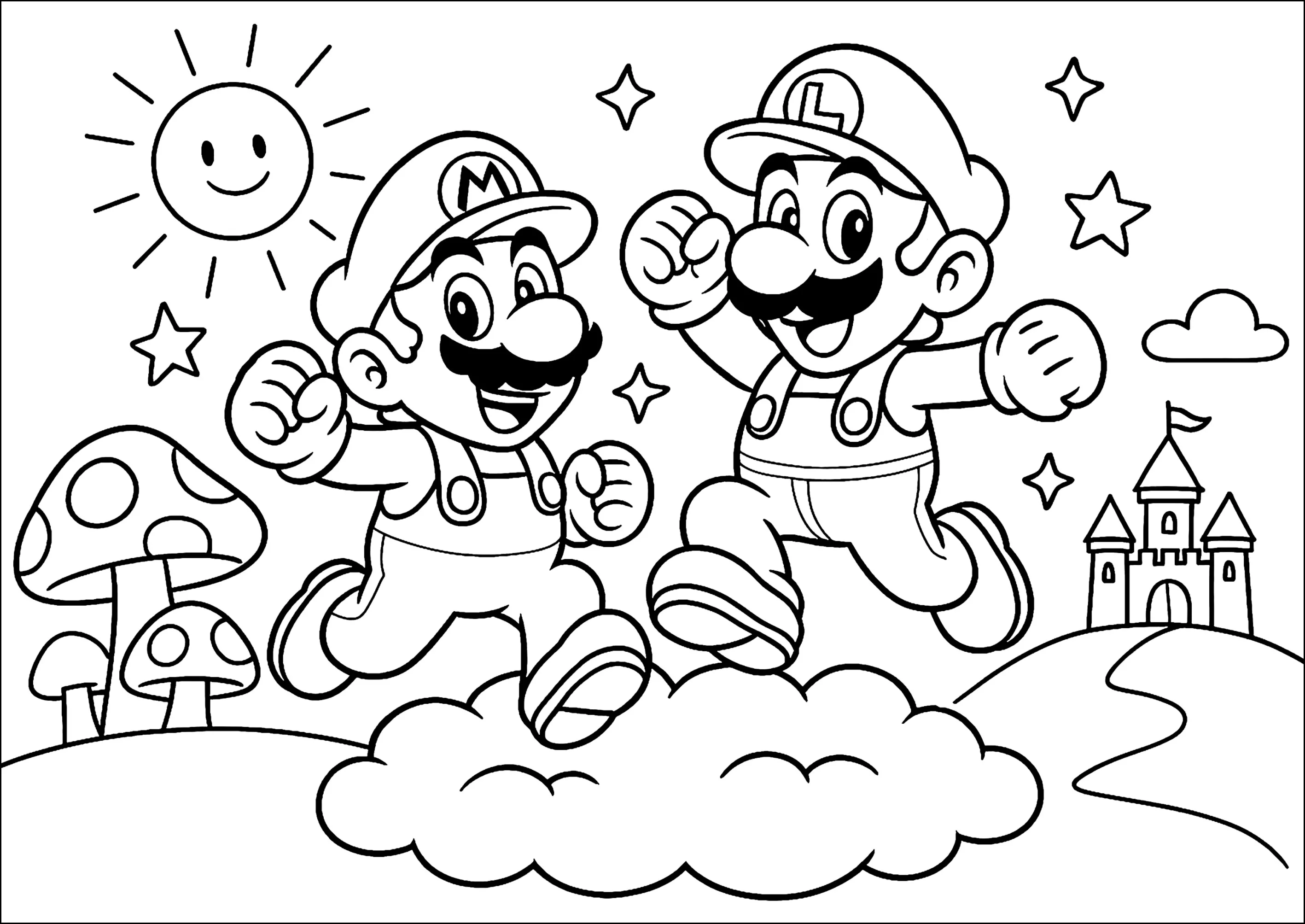 Mario et Luigi sur un nuage (Coloriage de Super Mario Bros.)