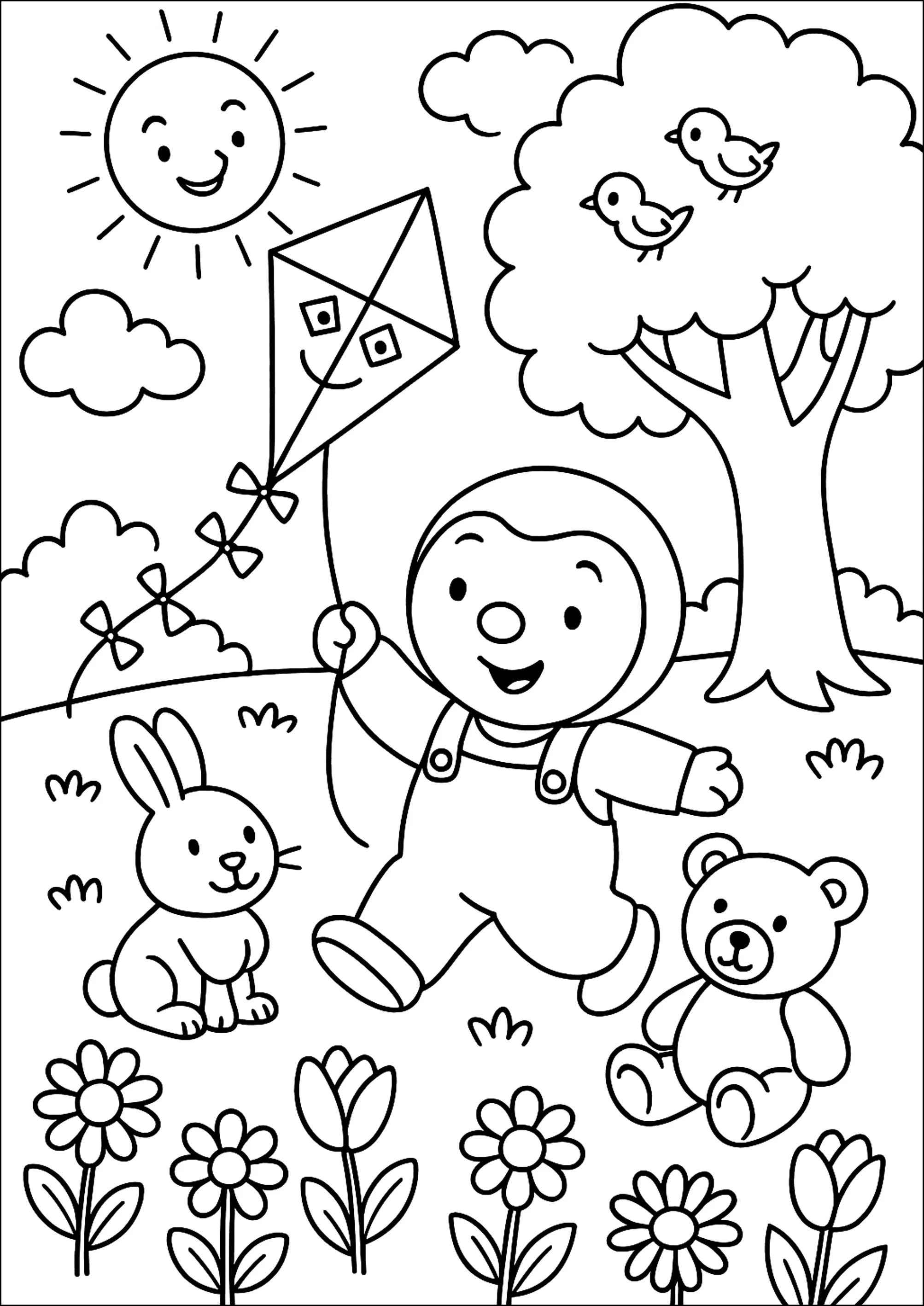 T'choupi s'amuse avec un cerf-volant pendant que des animaux attendrissants l'entourent. Des fleurs colorent le paysage, apportant une touche de vie à la scène.