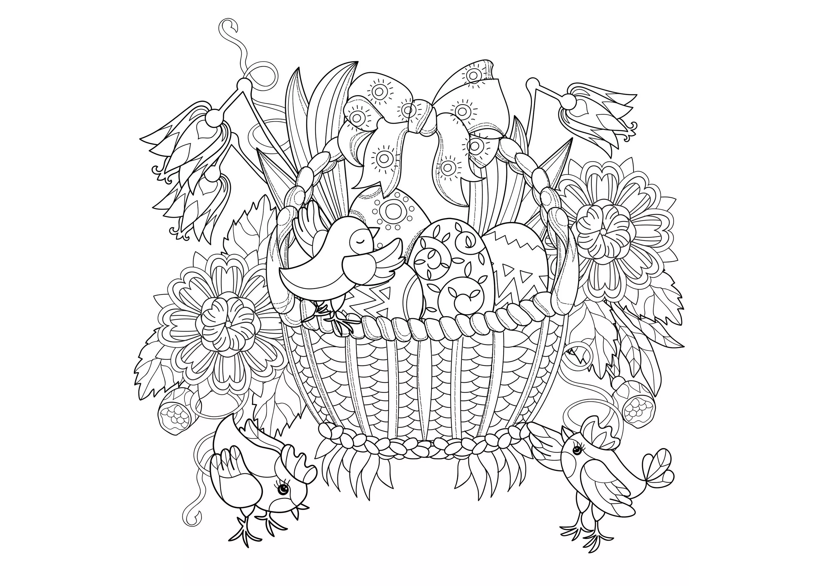 Panier de Pâques et oisillons (Coloriage de Pâques (Oeufs de Pâques, Lapins, Cloches…))