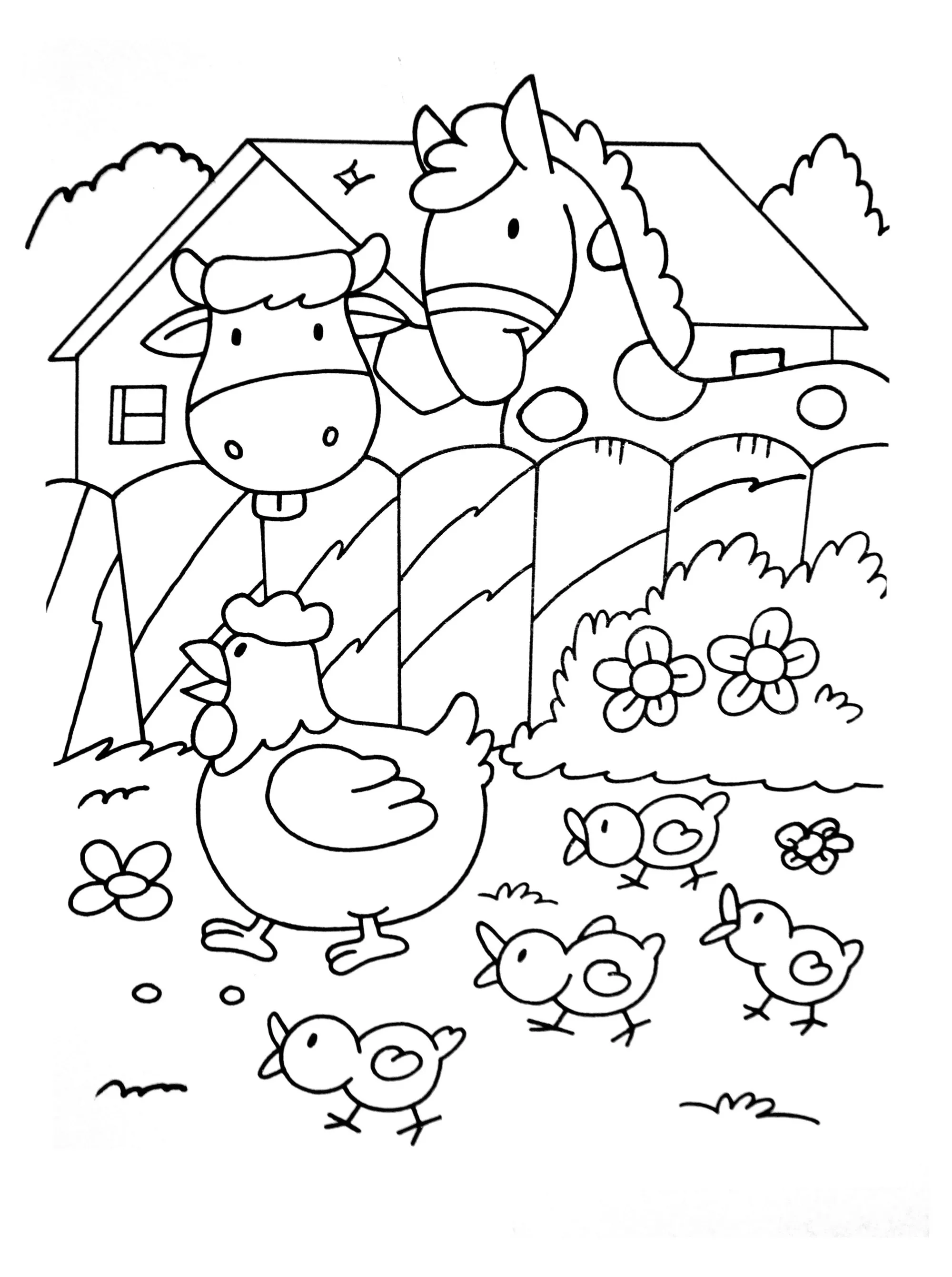 Poule et ses poussins, regardés par une vache et un cheval (Coloriage de Ferme)