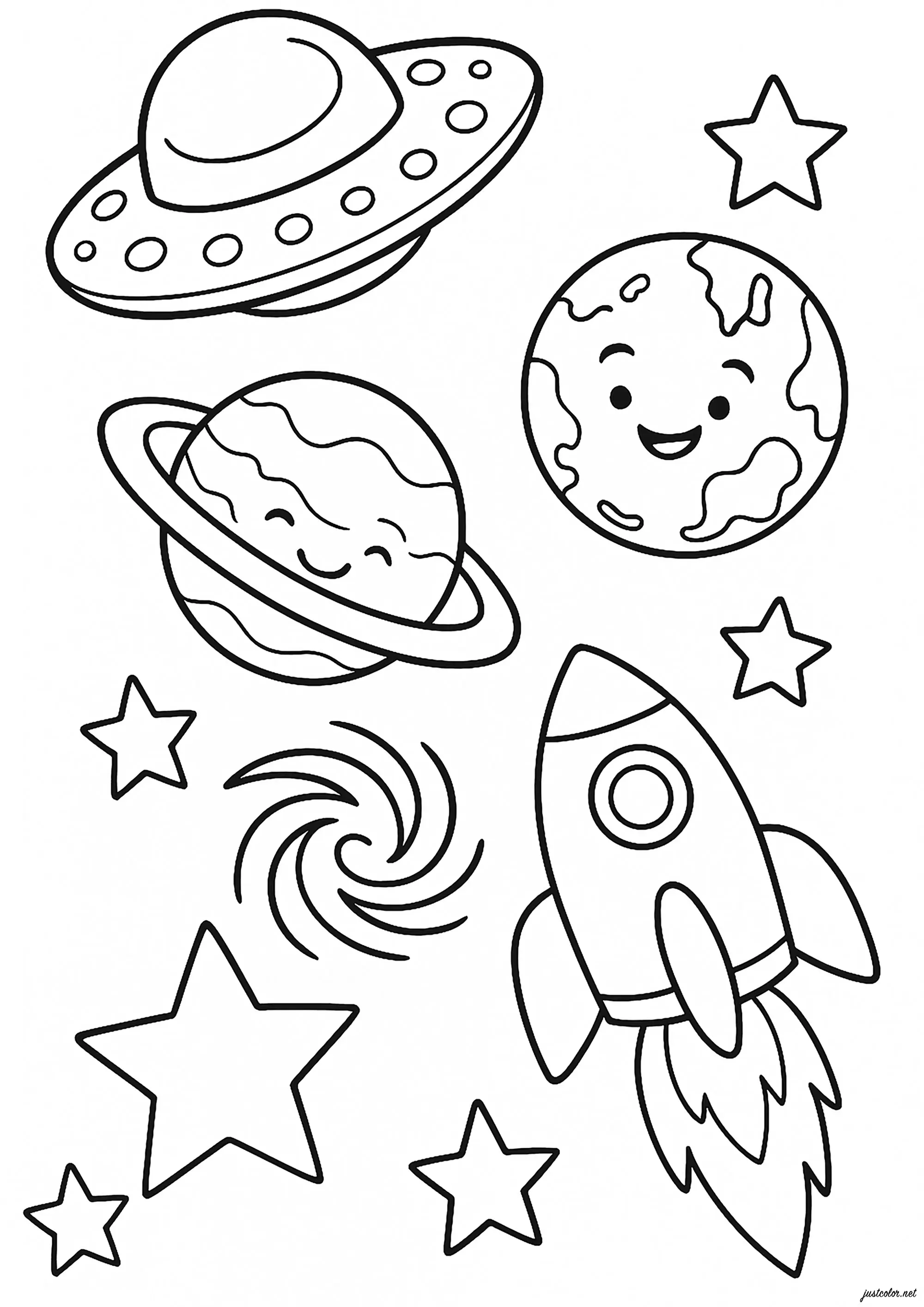 Joli dessin avec fusée, planètes, étoiles et soucoupe volante (Coloriage d'Espace (Planètes, Astres, Univers, Galaxies …))