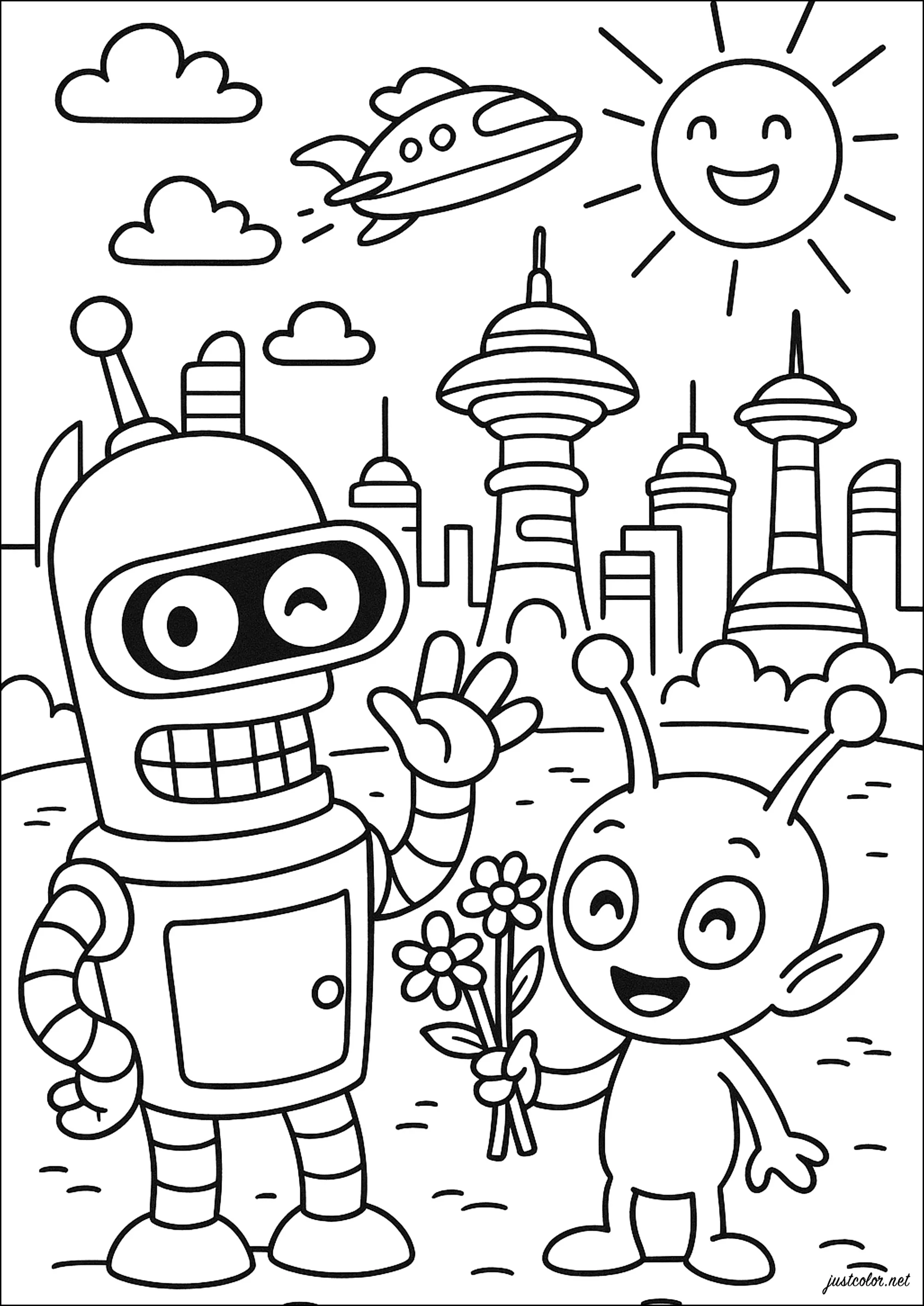 Un robot espiègle sourit aux côtés d'un gentil extraterrestre tenant un bouquet de fleurs. Des bâtiments futuristes et un vaisseau spatial ajoutent une touche d'aventure à la scène.