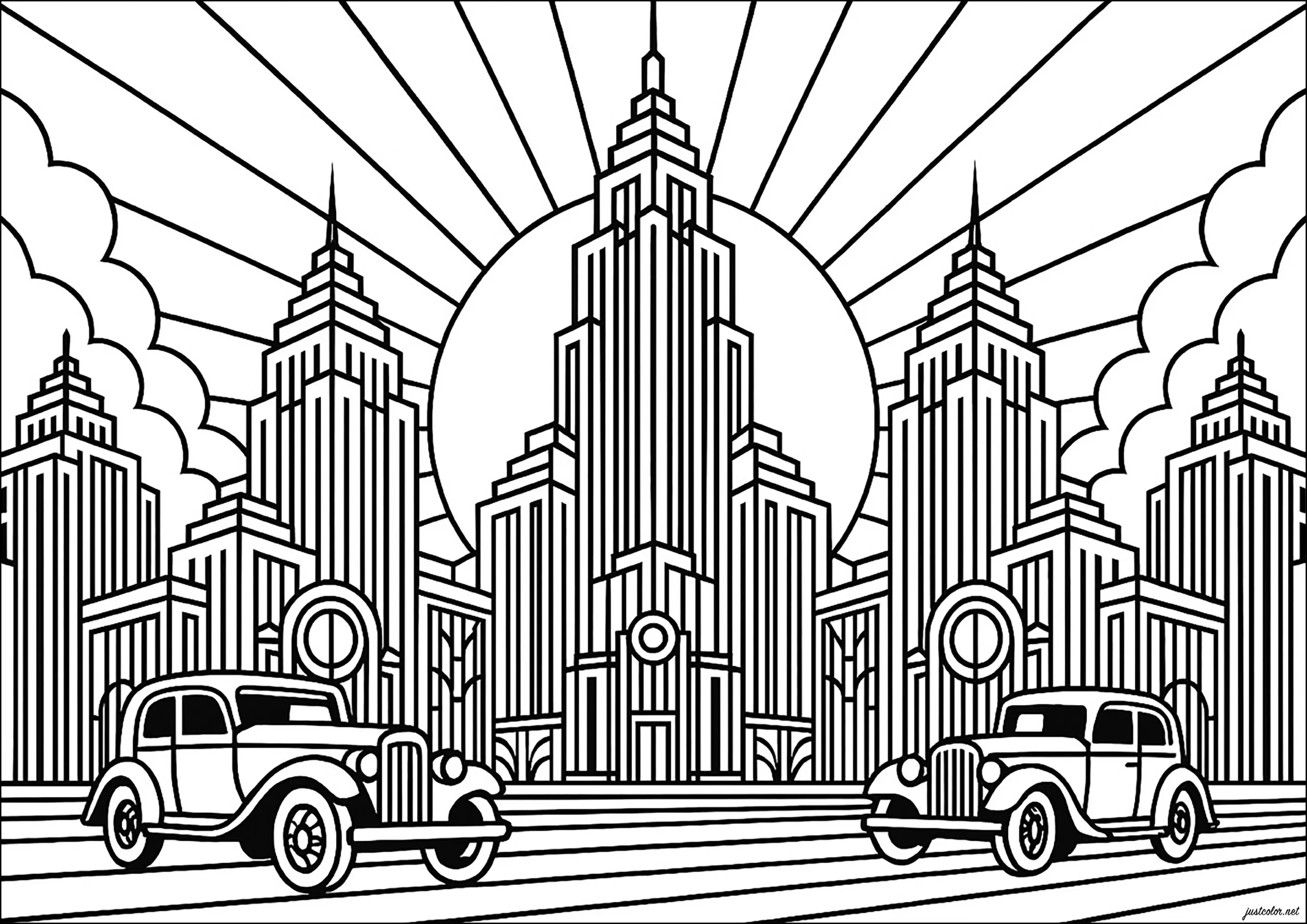 Ville aux gratte-ciels des années - 1930 (Coloriage d'Art Déco)