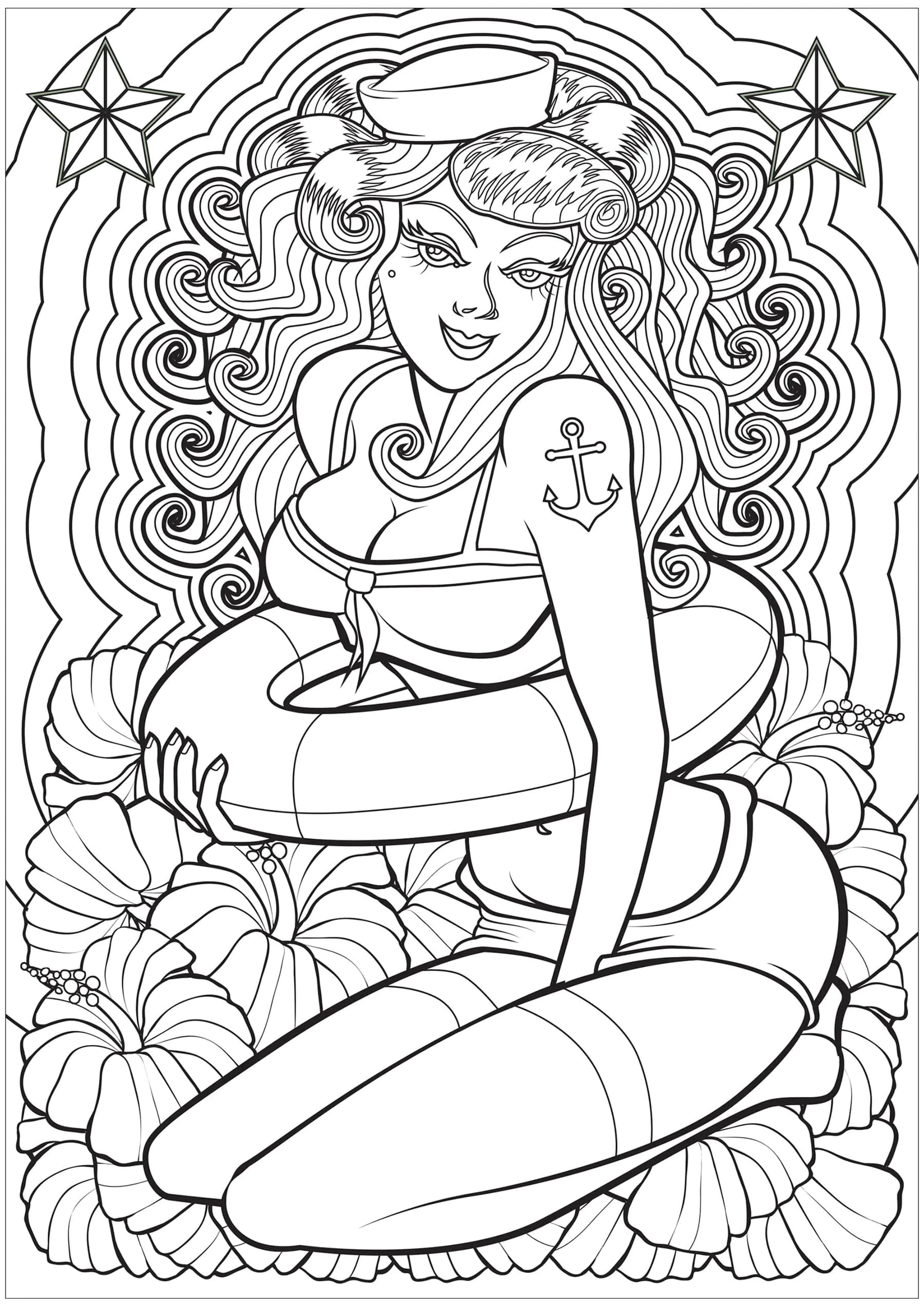 Femme sexy avec un tatouage marin, et de nombreux motifs à colorier en arrière plan