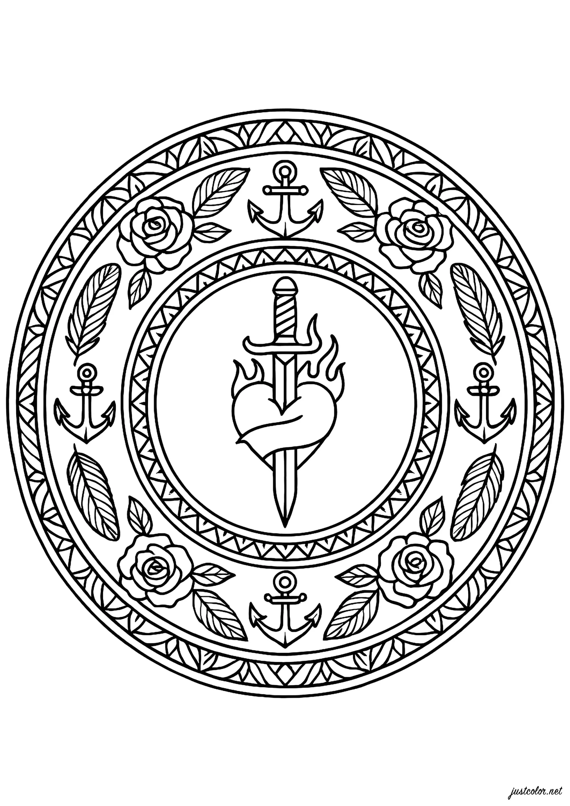 Mandala coeur et épée (Coloriage)