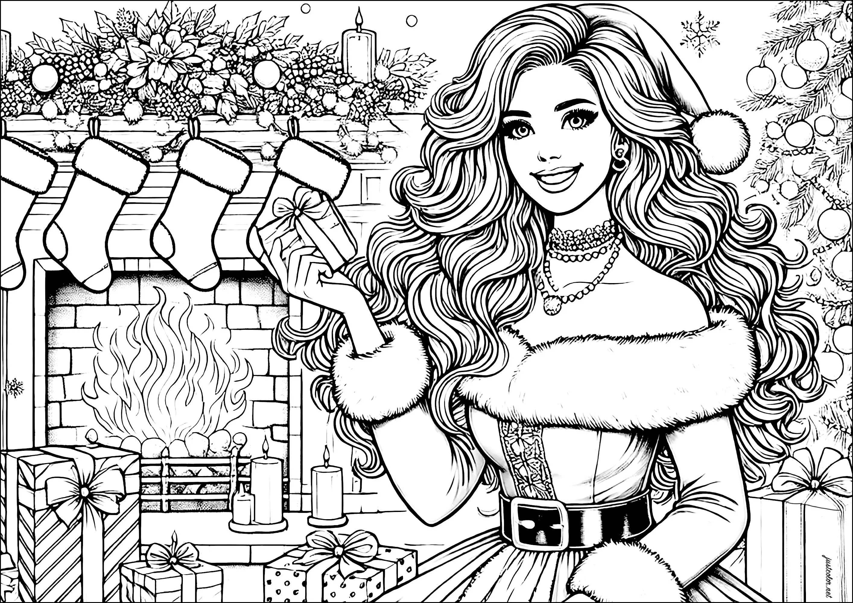 Femme habillée en mère Noël, avec des cadeaux (Coloriage)