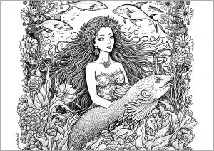 Coloriez cette petite sirène qui dort calmement dans une mer pleine de motifs magnifiques et complexes