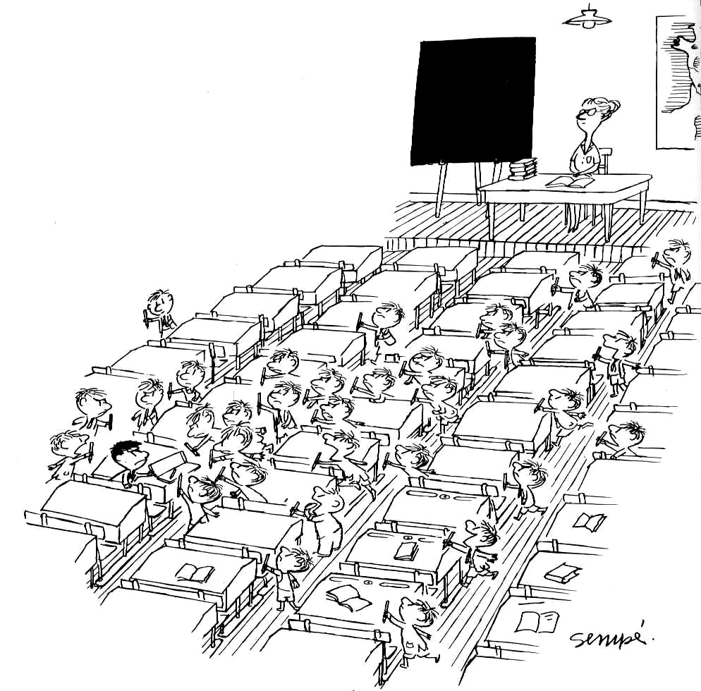 Illustration tirée du Petit Nicolas, avec la classe au grand complet, vue de dessus. Donc beaucoup d'élèves et de tables, à mettre en couleur sans se presser, même si Goscinny préférait le noir