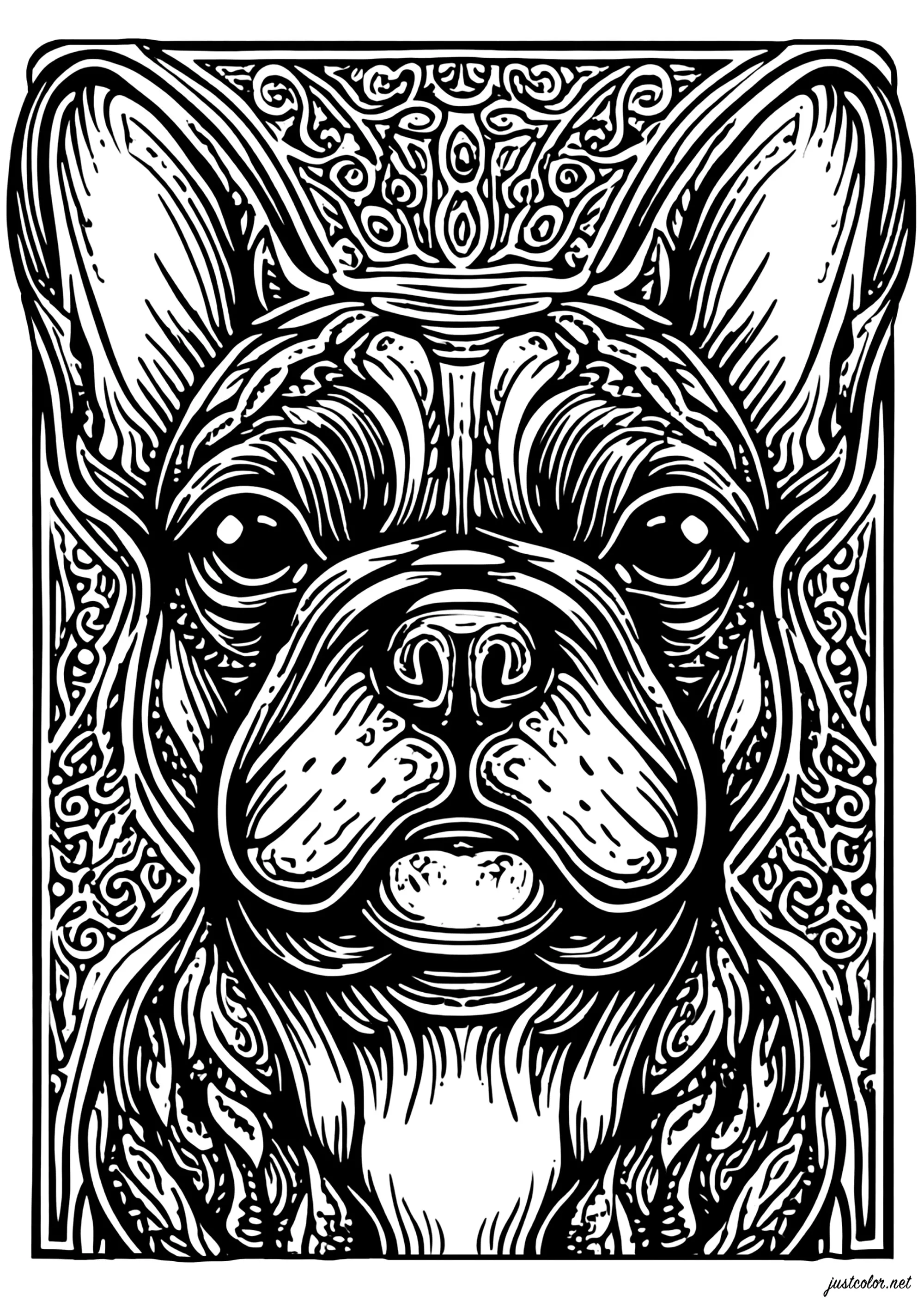 Un superbe coloriage représentant un bouledogue français en portrait frontal, dessiné dans un style ornemental riche en détails. Le fond est composé de motifs décoratifs complexes qui mettent en valeur l’expression unique et les traits caractéristiques de cette race : museau court, grandes oreilles droites et regard expressif.
