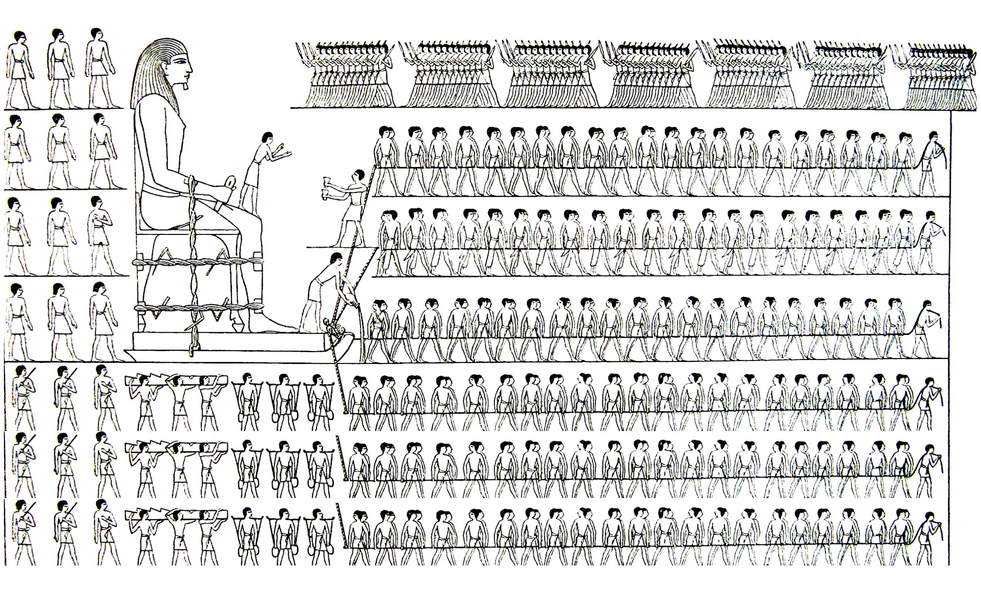 Coloriage Egyptien à partir de réels motifs d'époque : Un Pharaon magistral et ses disciples