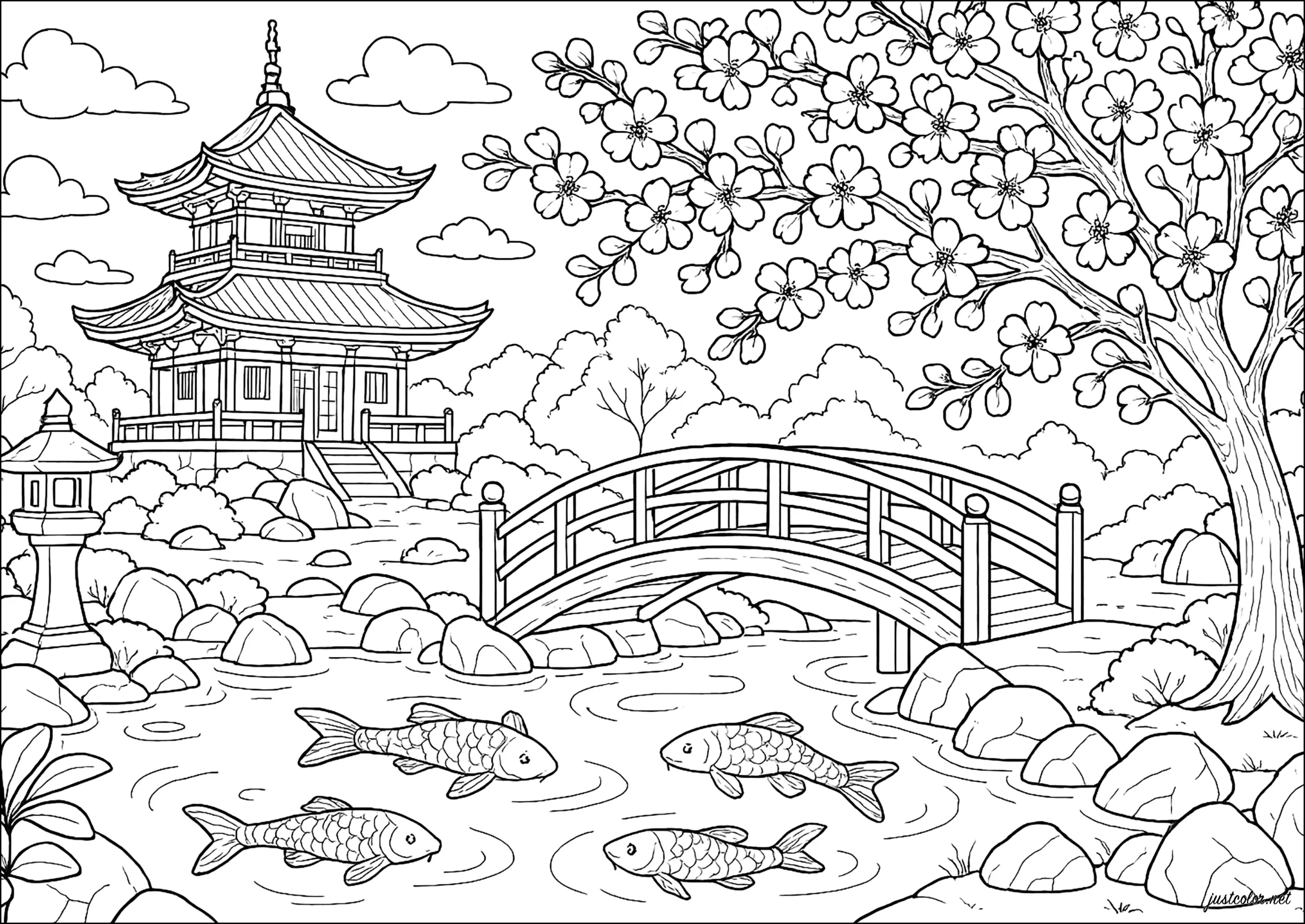 Jardin tranquille avec poissons paisibles (Coloriage de Japon)