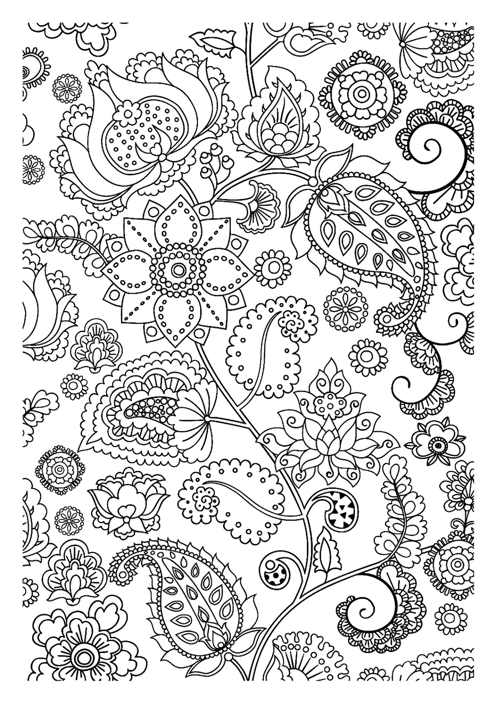 Pagina da colorare di un perfetto antistress con fiori e foglie