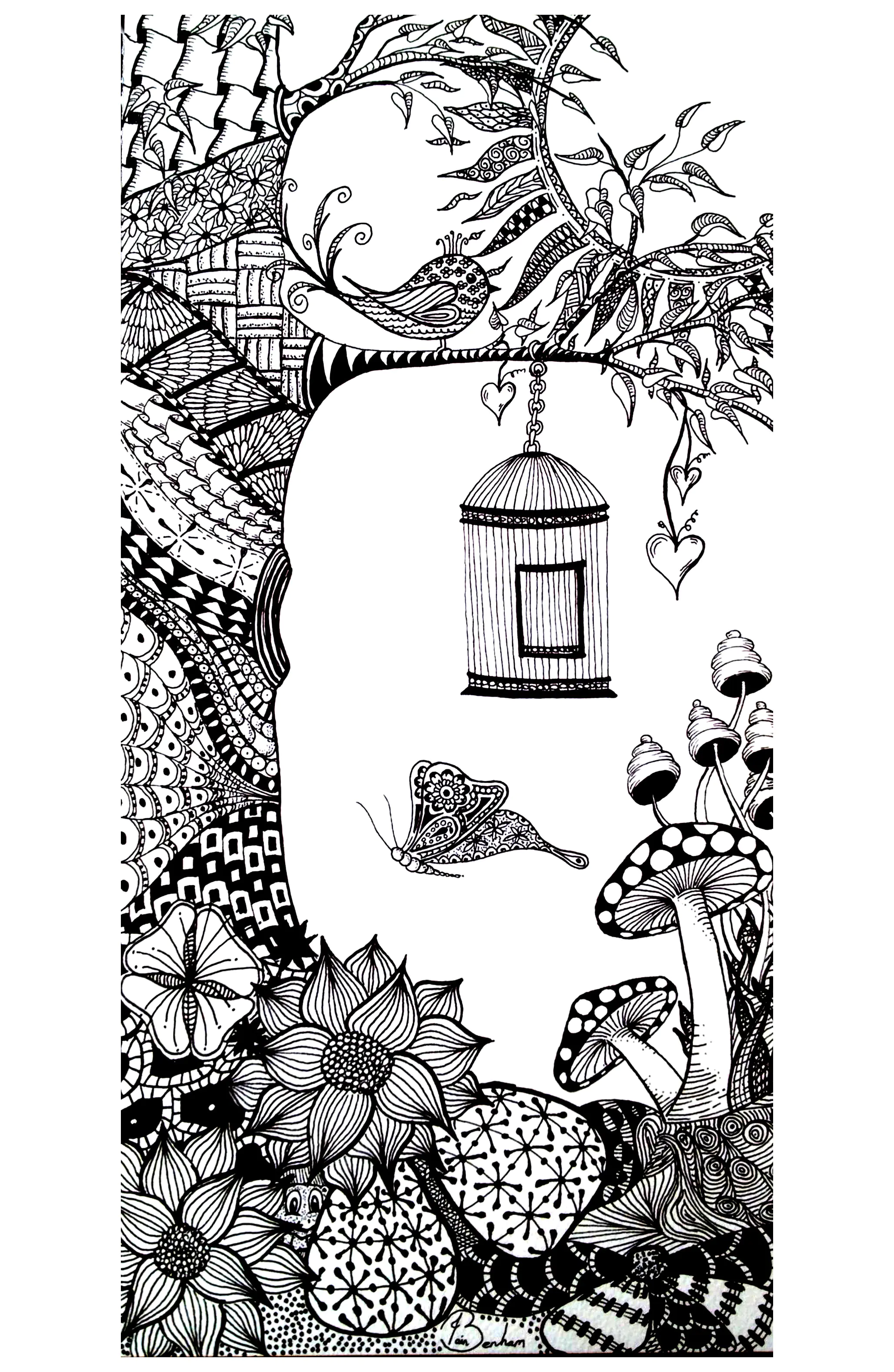 Farfalle, uccelli e funghi (Pagina Fiori e vegetazione da Colorare)