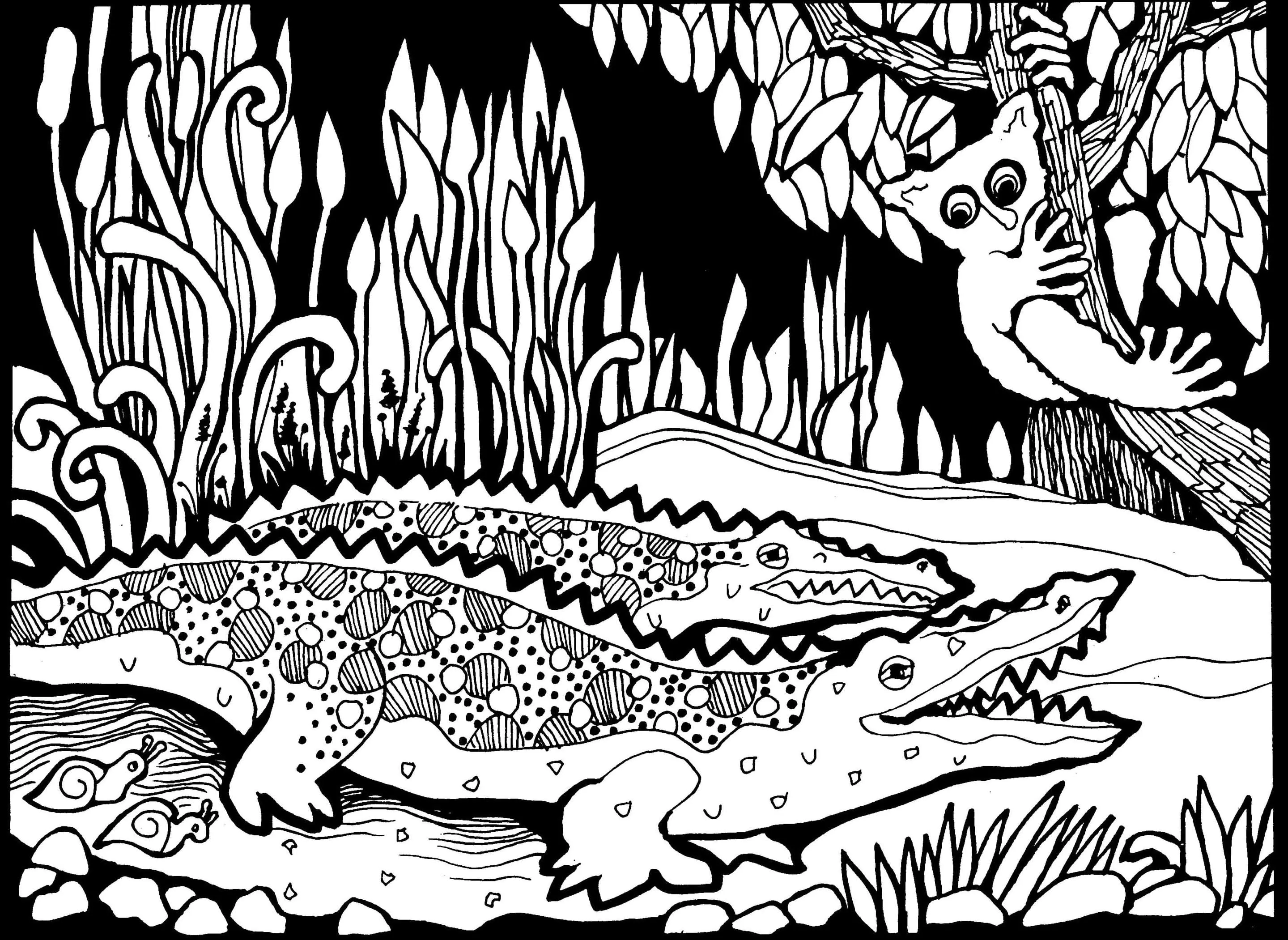 Coccodrilli che guardano una strana creatura su un albero (Pagina Africa da Colorare)