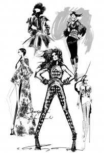 そして、こちらがとても「ファッション」な塗り絵ギャラリーです。デザイナーからインスピレーションを得たスケッチ、モデル画、さらにはジュエリーまで揃っています!