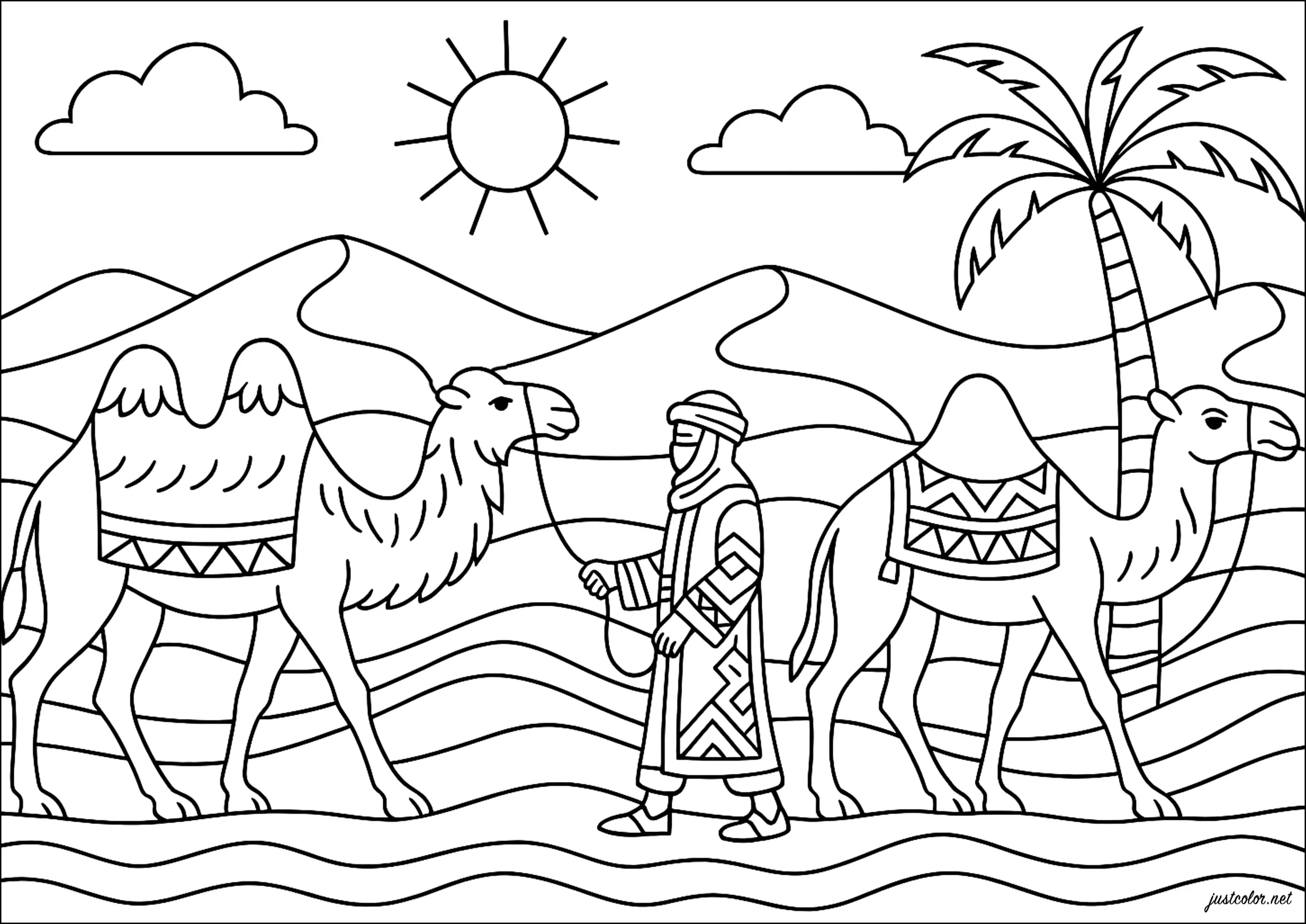 Nomadic caravan in the dunes (Camels and dromedaries Coloring Page)