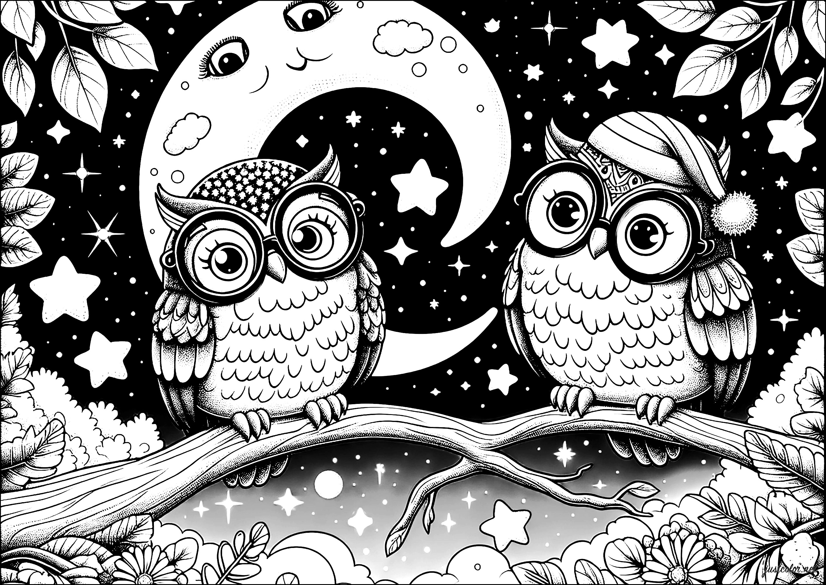 Pretty owls under the bright moonlight (Coloring Page)