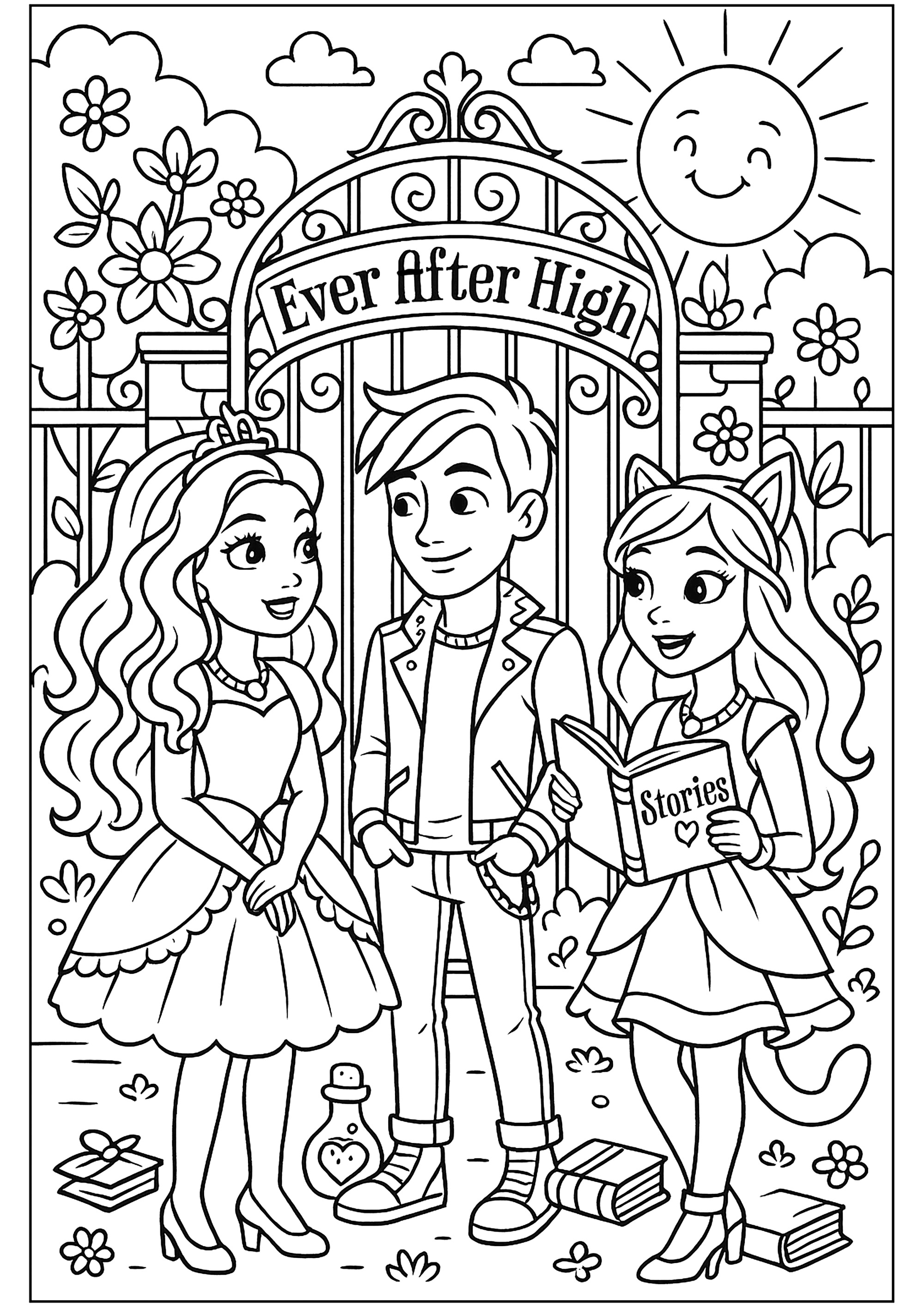 Three characters in a garden (Ever After High Coloring Page)