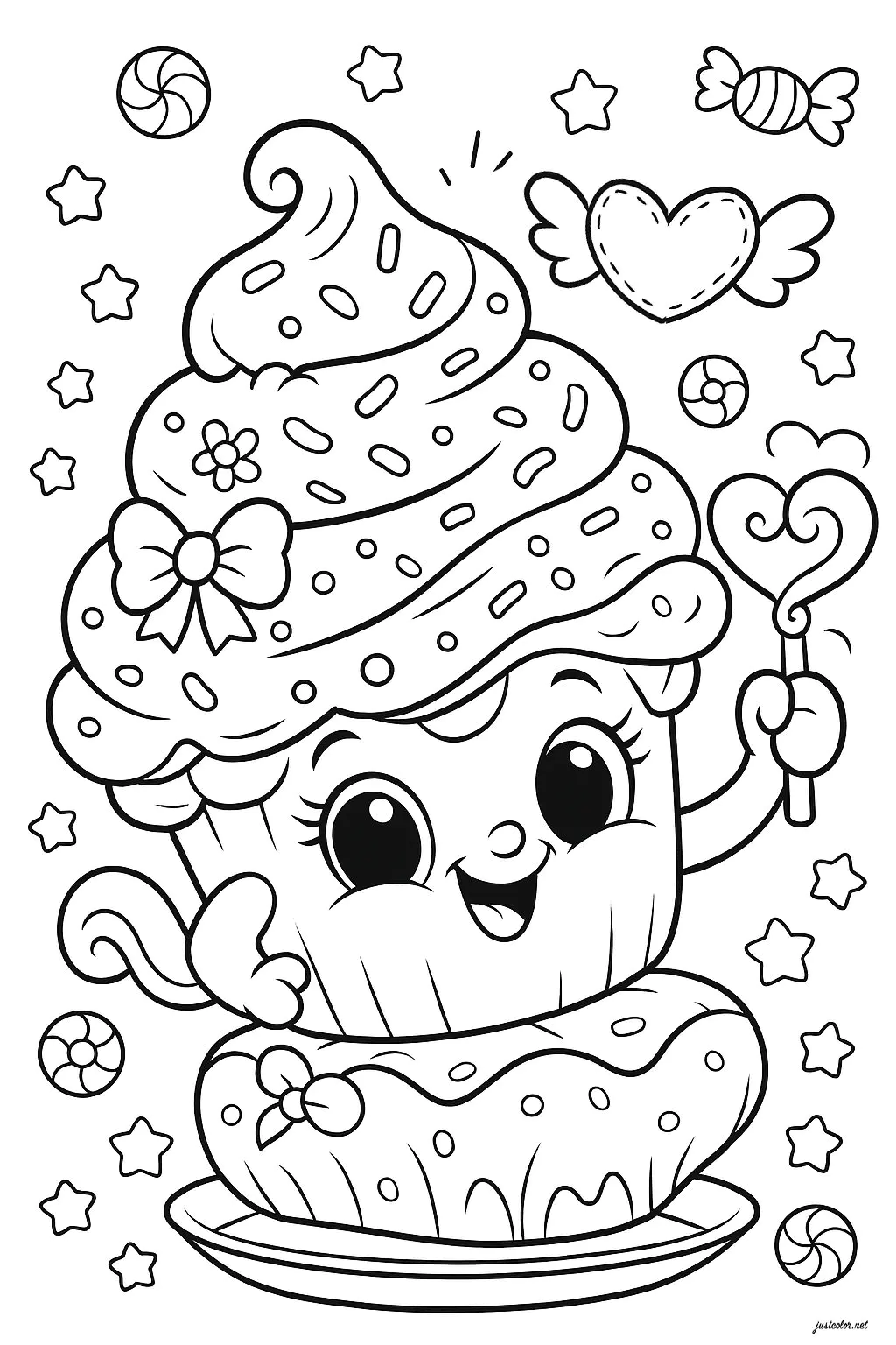 Sweet Cupcake surrounded by stars and hearts (Cupcake And Cake Coloring Page)