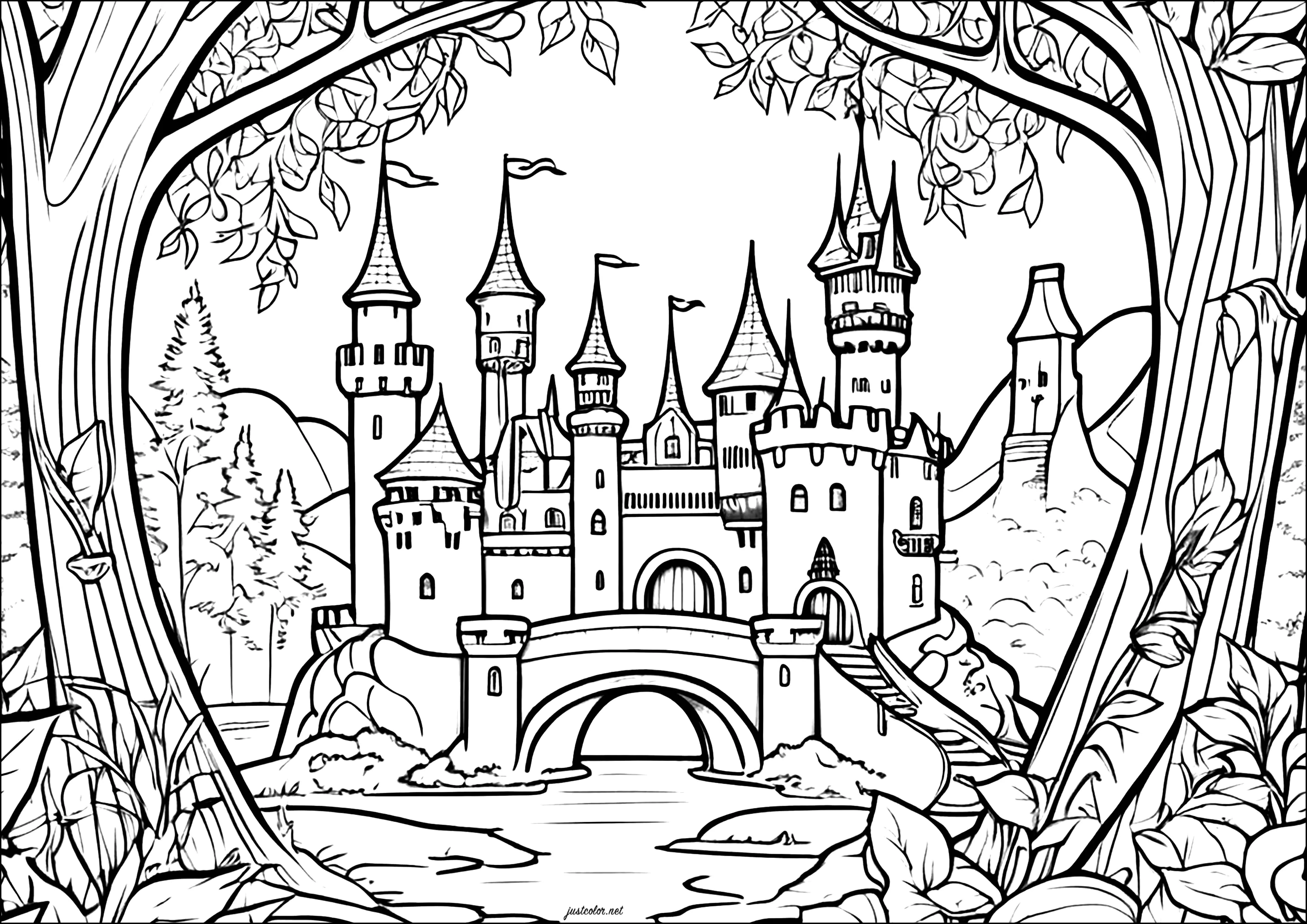 Magnificent castle in the forest (Knight, Castle and Dragon Coloring Page)
