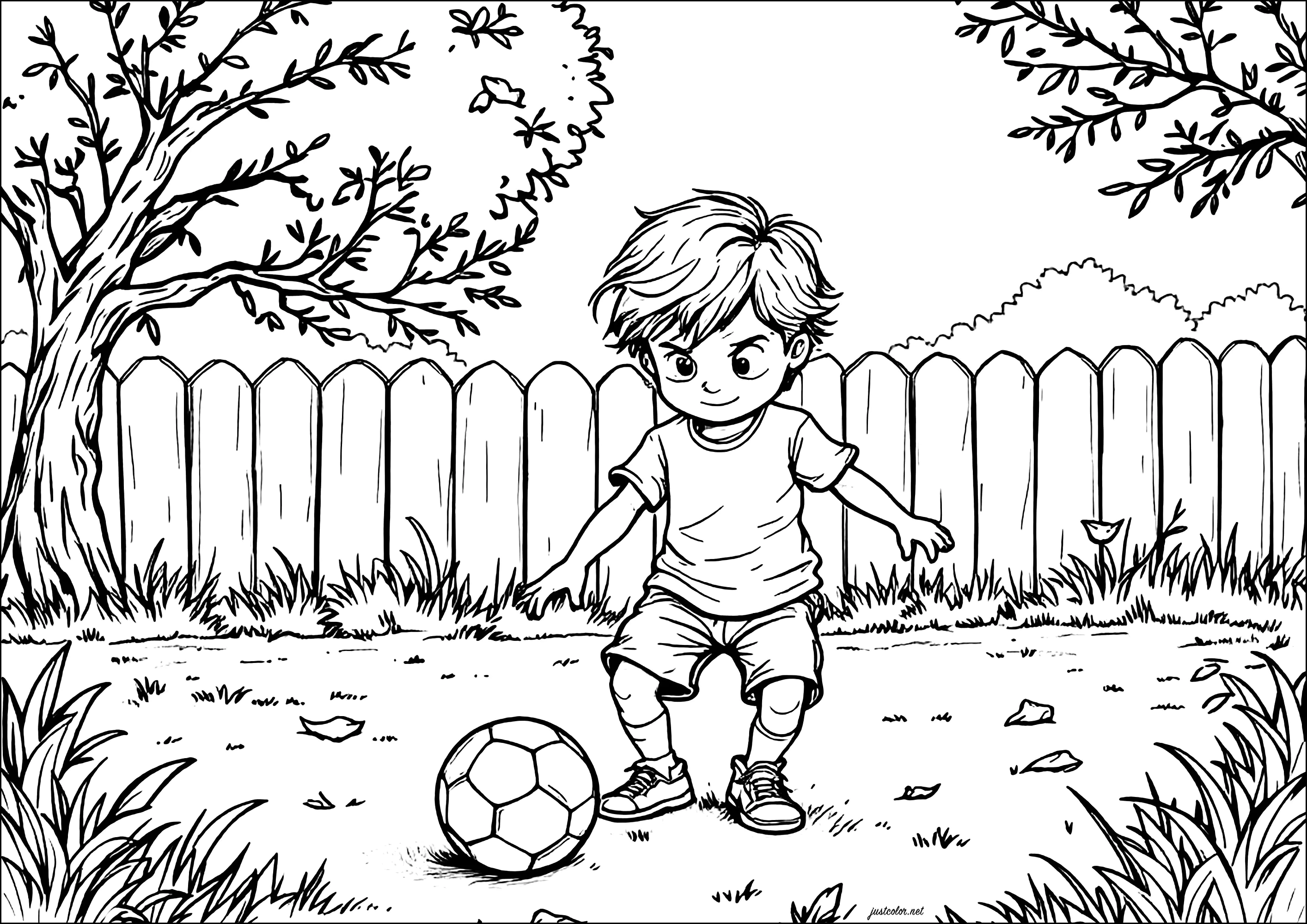 Young boy playing soccer in his garden (Coloring Page)