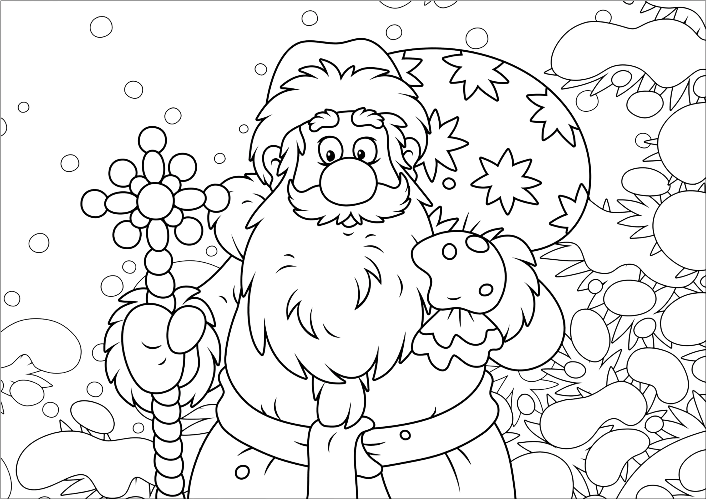 Ein hübsches Weihnachtsausmalbild mit einer verschneiten Landschaft und einem Weihnachtsmann, der im Cartoon-Stil gezeichnet ist.