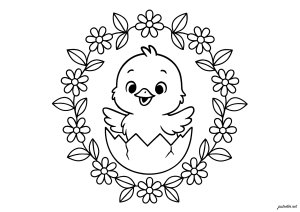 Süßes Küken, das aus einem bunten Ei schlüpft, umgeben von Blumen und Motiven zum Ausmalen.