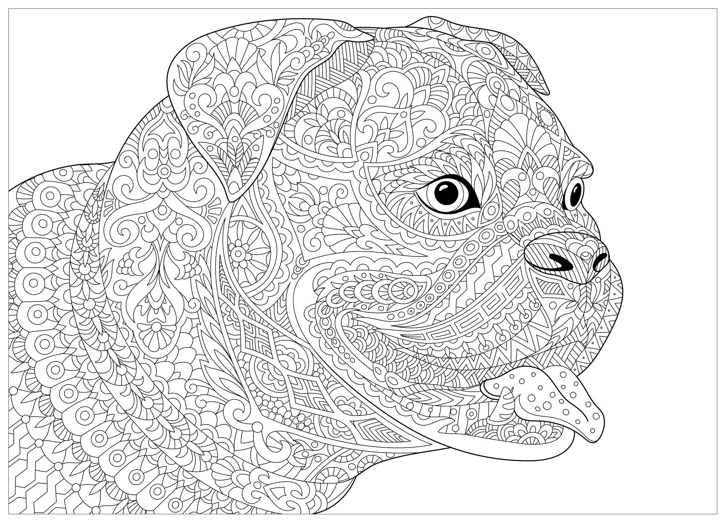 A trendy and somewhat difficult Dog colouring page for adults, to print or download.