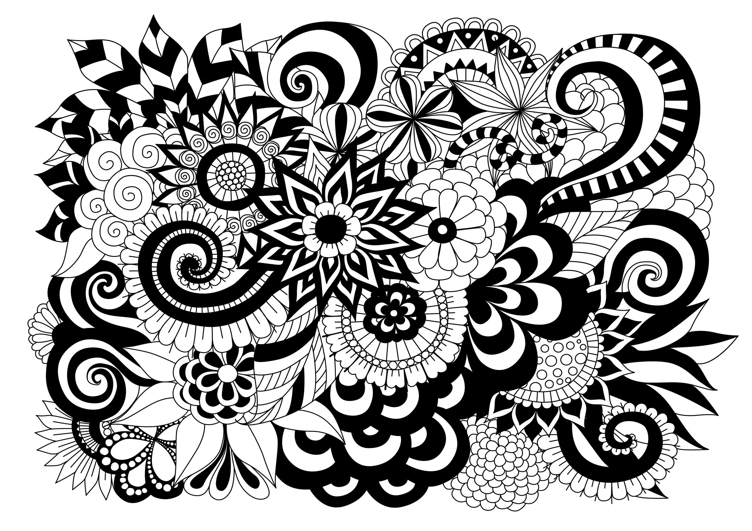 Magnificent and very contrasted adult coloring page, representing numerous flowers and leaves