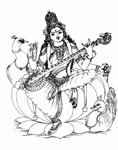 Saraswati picture to print and color: Hindu divinity of wisdom and arts